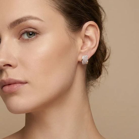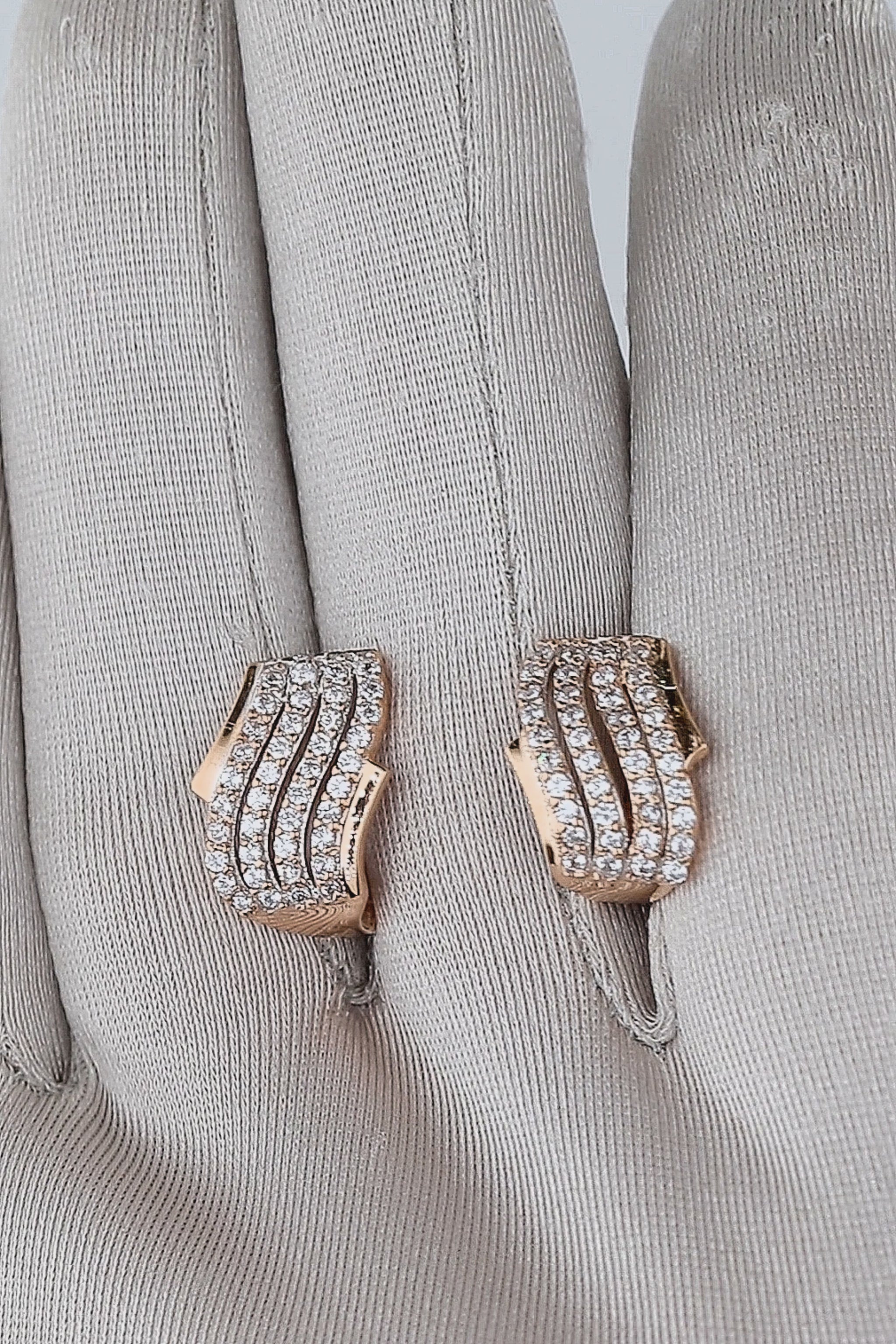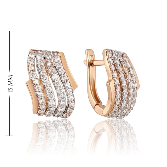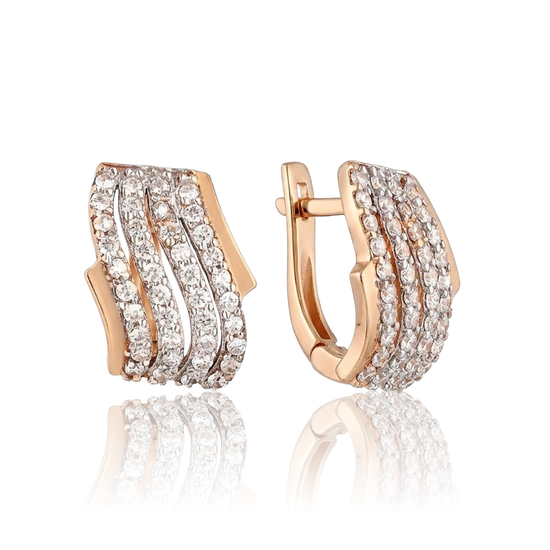 Classic red gold earrings (15 mm), decorated with several wavy rows of small white stones. The expressive design creates waves of radiance, giving a sense of luxury and elegance.