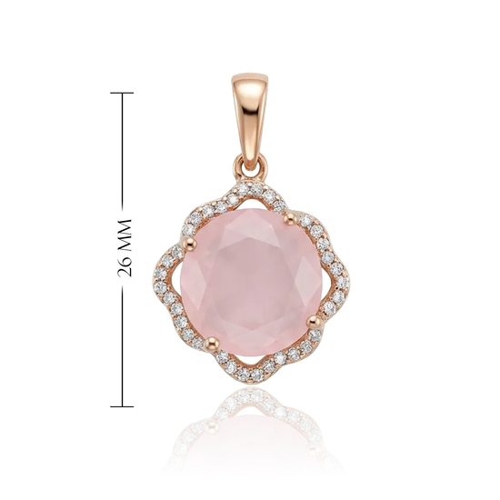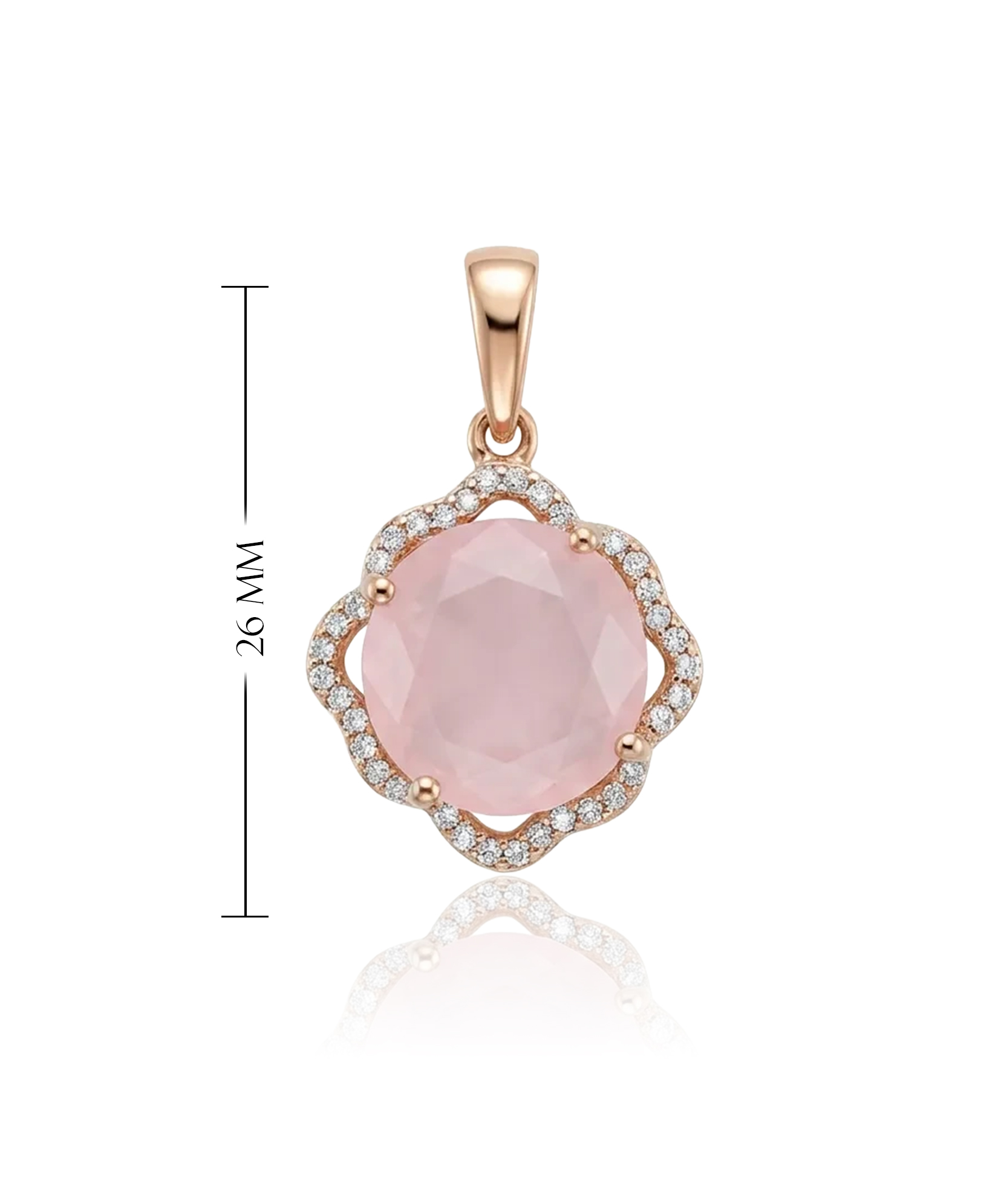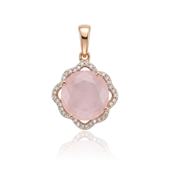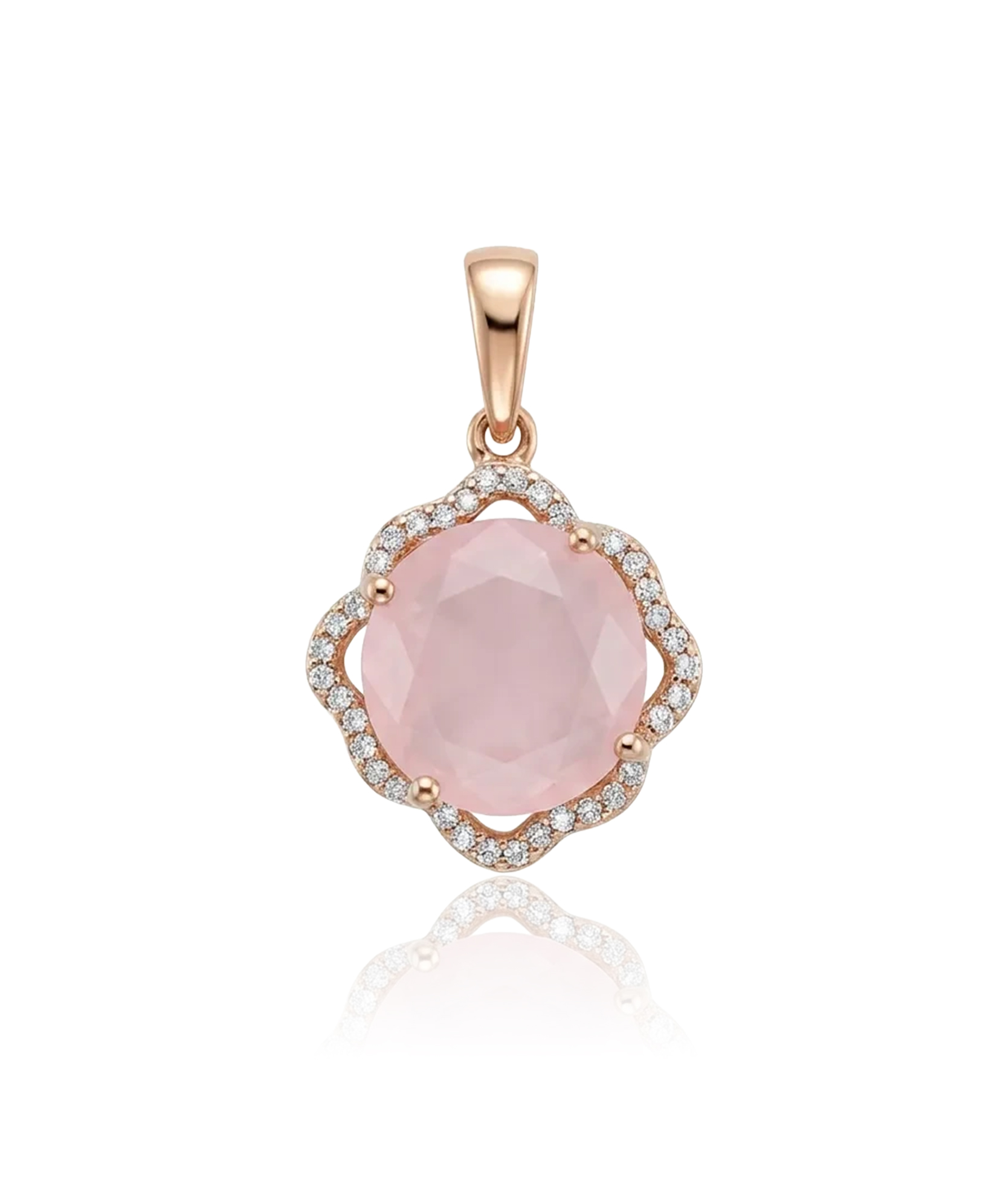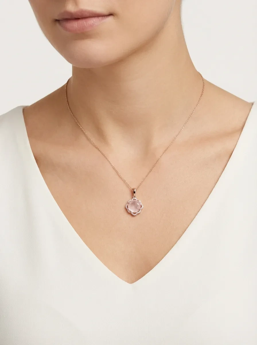 A rose gold pendant with rose quartz and white zircon accents is a romantic and elegant piece of jewelry.