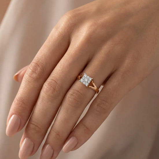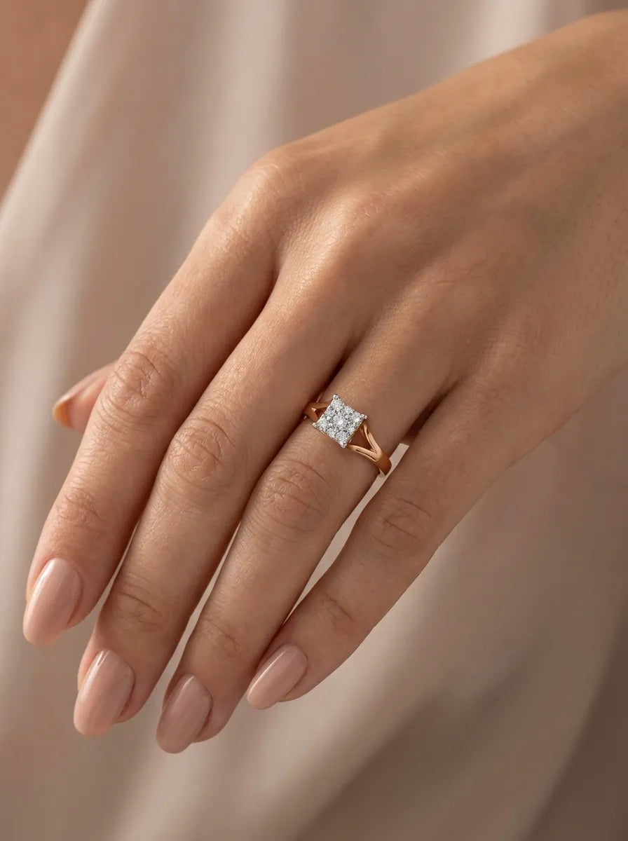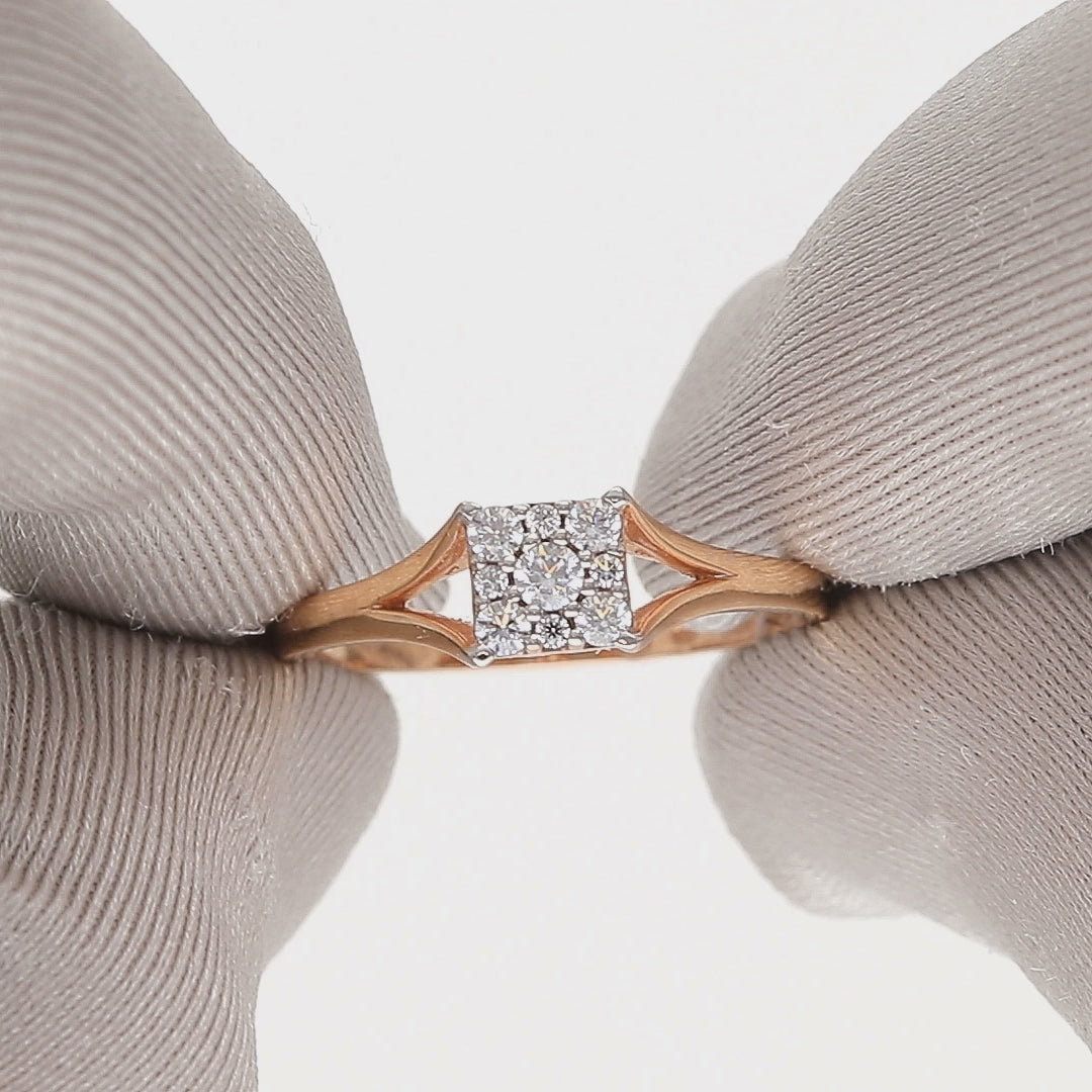 Elegantiškas auksinis žiedas su kvadrato formos akmenų kompozicija. Centre išdėstyti spindintys akmenys sukuria subtilų prabangos įspūdį, o ažūriniai šonai suteikia modeliui lengvumo ir išskirtinumo.