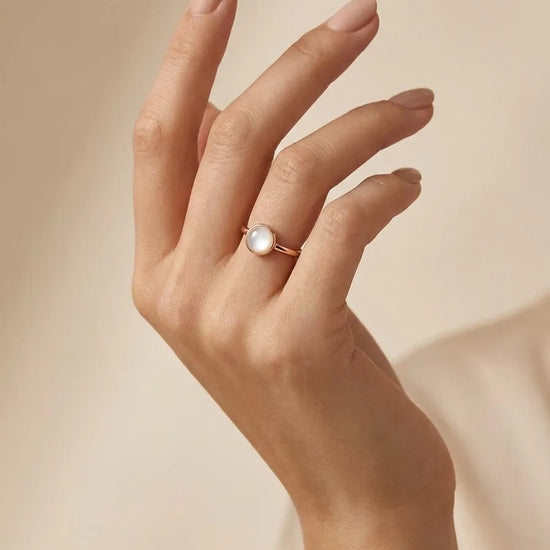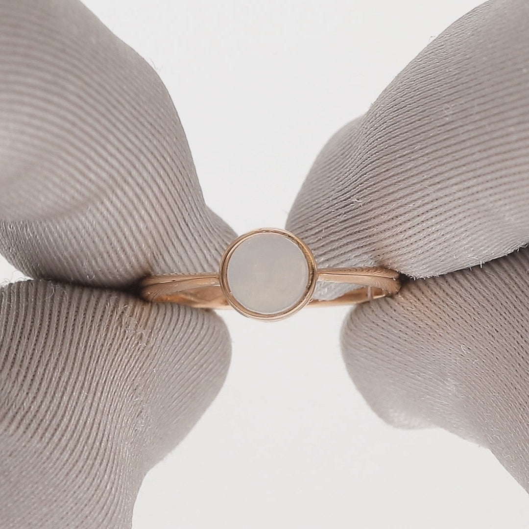 Subtilus ir elegantiškas raudono aukso žiedas, puoštas apvaliu perlamutro akmeniu. Švelniai spindintis paviršius suteikia papuošalui išskirtinio lengvumo ir rafinuotumo.