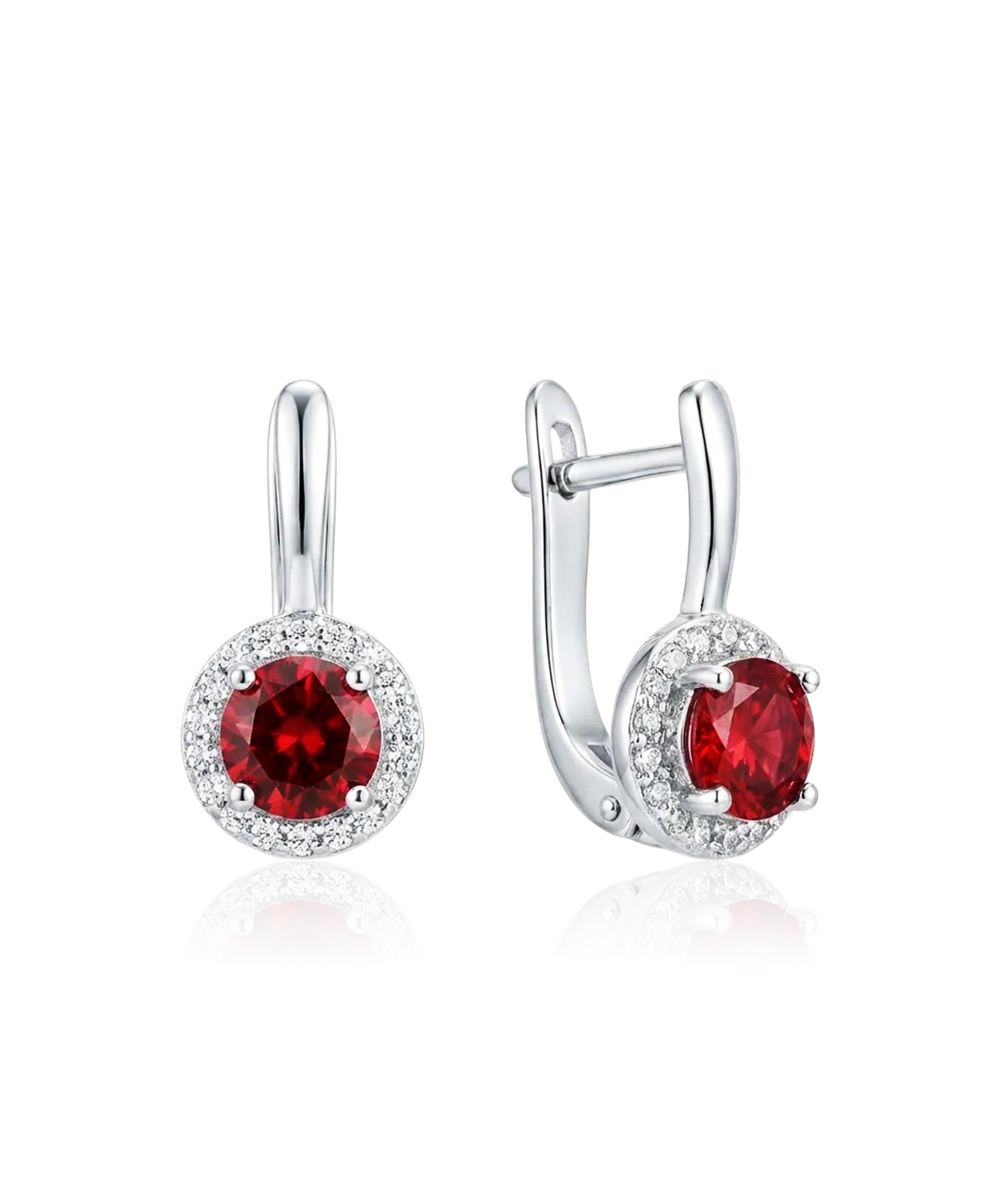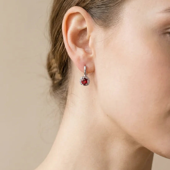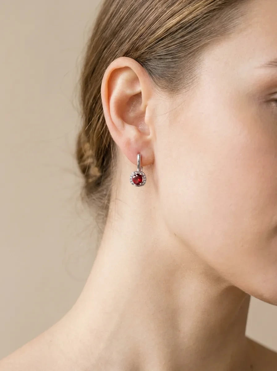 Sidabriniai auskarai su raudonais cirkoniais – subtilus ir elegantiškas pasirinkimas kasdienai ar progoms. Ryškus centrinis akmuo harmoningai dera su žėrinčiu cirkonių rėmeliu, suteikdamas prabangos ir išskirtinio spindesio.