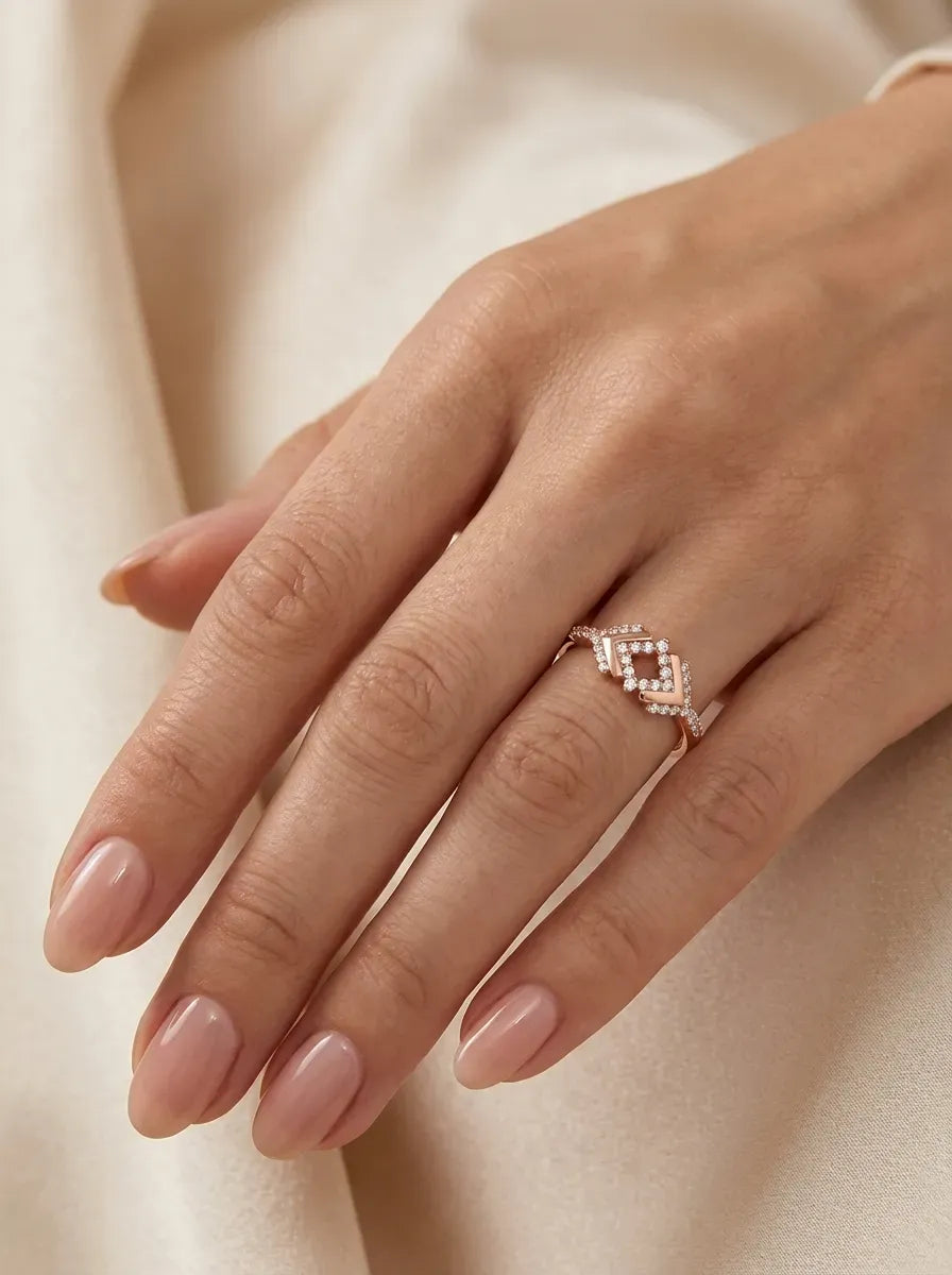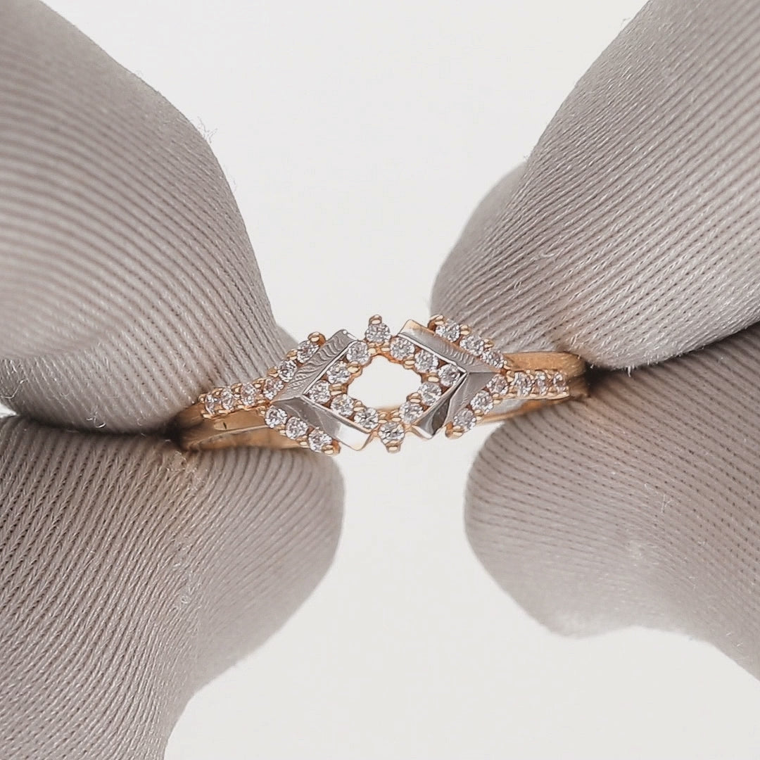 Išskirtinio dizaino raudono aukso žiedas, dekoruotas spindinčiais cirkoniais. Geometrinė forma su subtiliai persipinančiais elementais suteikia papuošalui modernumo ir elegancijos.