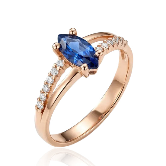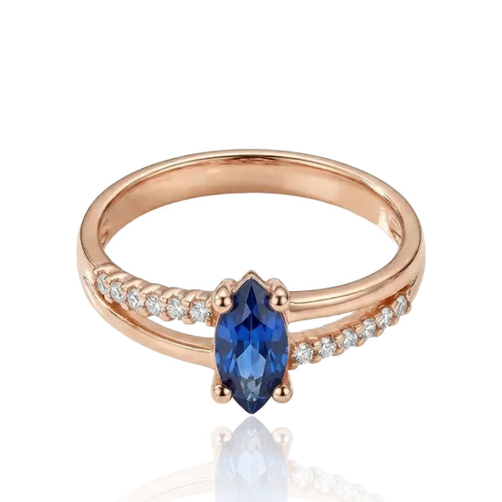Izteiksmīgs sarkanā zelta gredzens ar tumši zilu cirkonu un smalki novietotām sānu acīm. Centrālais akmens ir ovālas formas, smalki pacelts, lai uzsvērtu dziļumu un mirdzumu. Šis gredzens apvieno klasisko zelta toni ar piesātinātu zilu krāsu, radot ekskluzivitātes un elegances iespaidu.