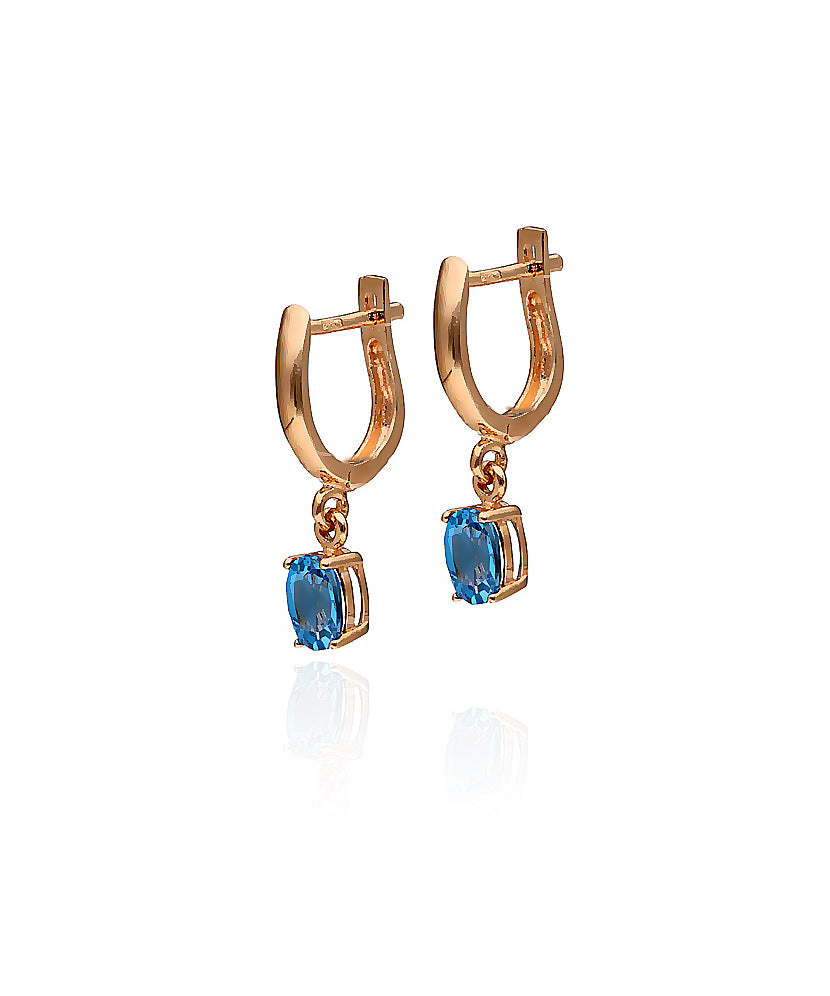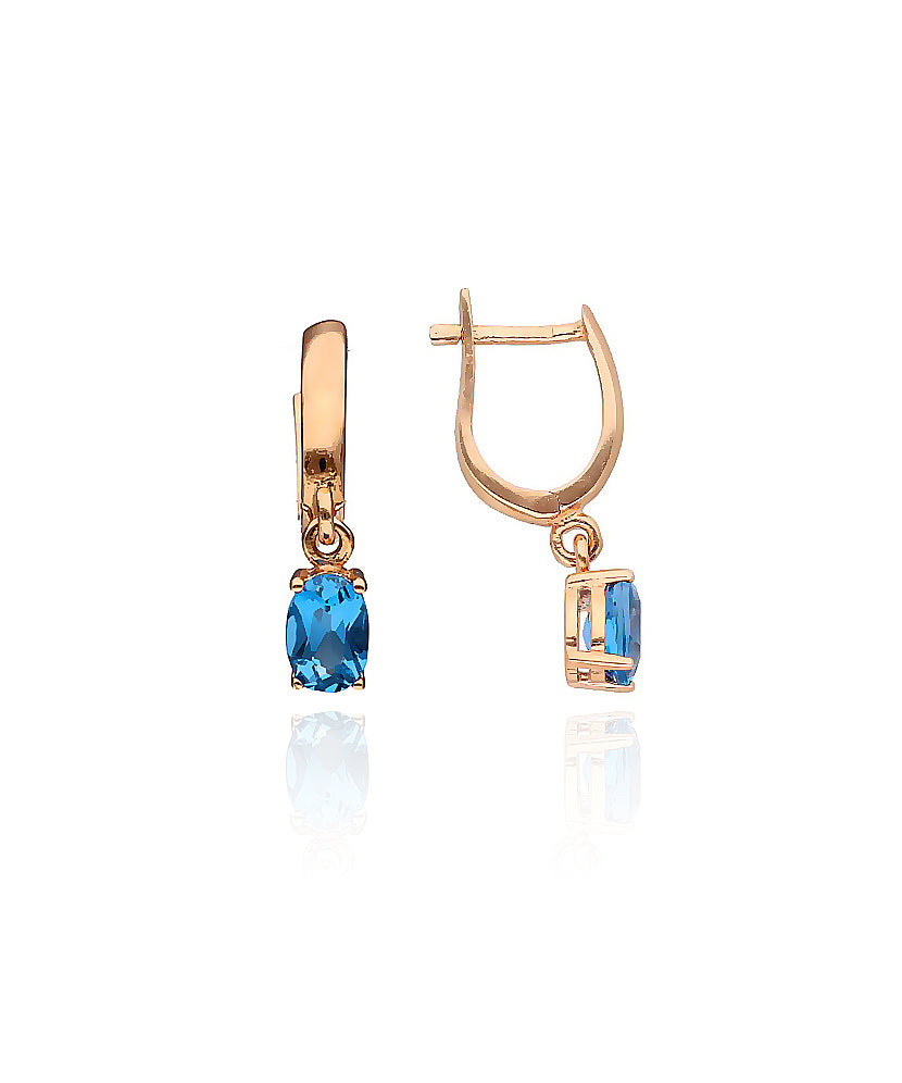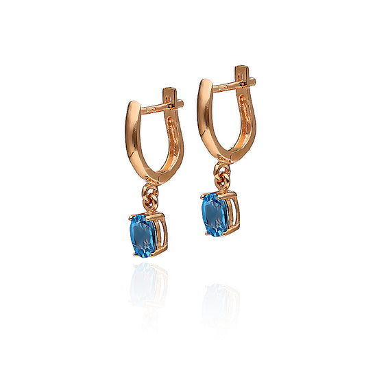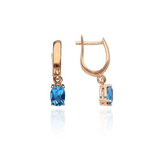 Raudonojo aukso auskarai su mėlynais akmenimis. Elegantiškas dizainas su pakabuku suteikia išskirtinį spindesį ir tinka tiek kasdienai, tiek ypatingoms progoms.