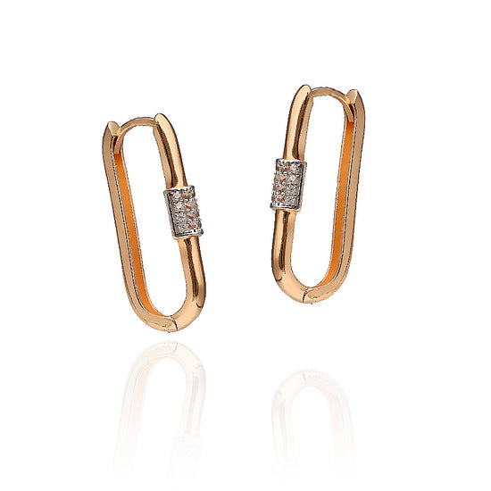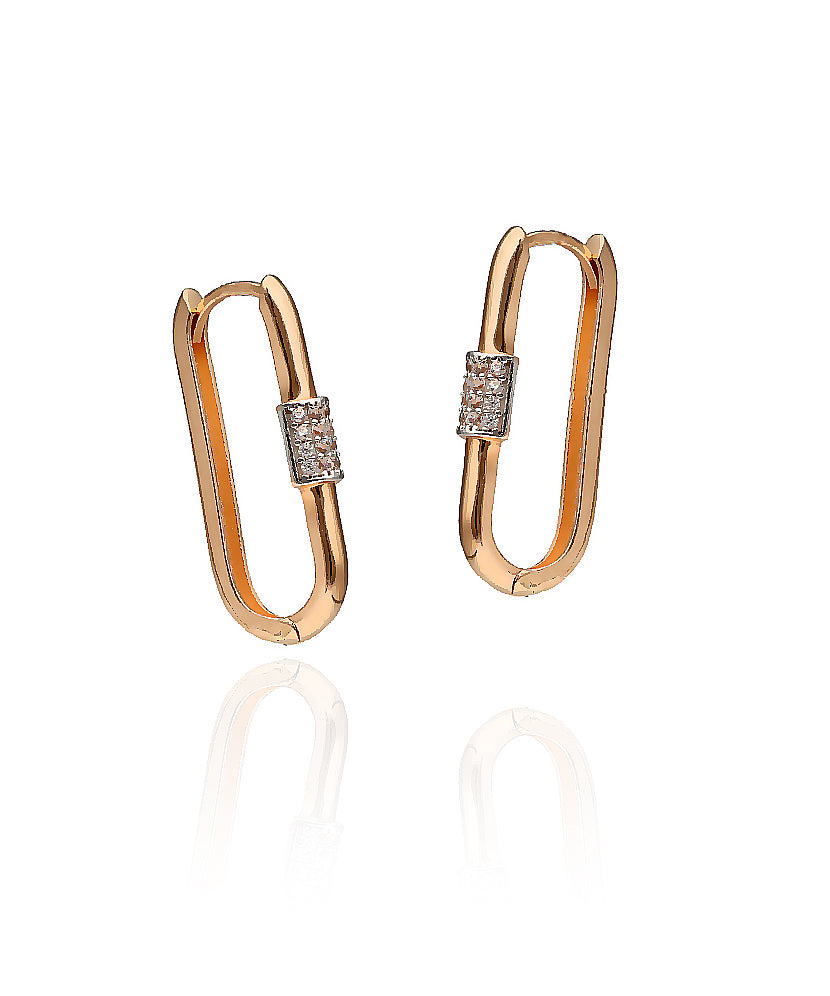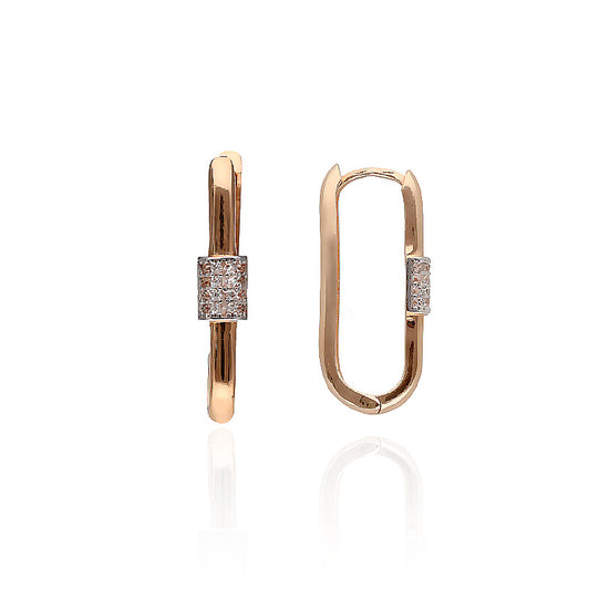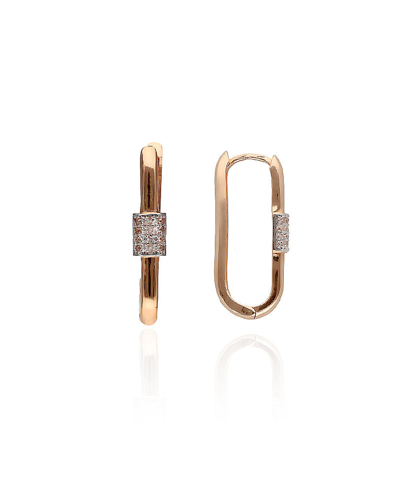 Modernūs raudonojo aukso auskarai (26 mm) su stačiakampiu akcentu, inkrustuotu smulkiais baltais akmenukais. Minimalistinis, bet elegantiškas dizainas suteikia subtilaus spindesio ir lengvai dera prie įvairaus stiliaus.