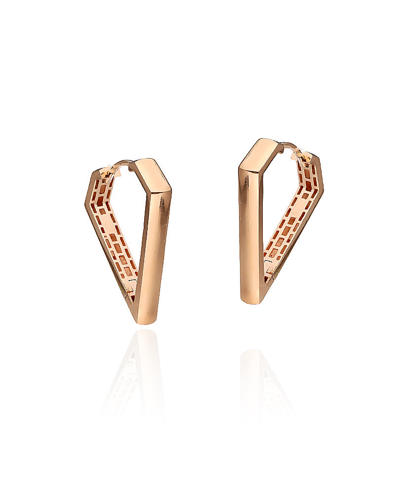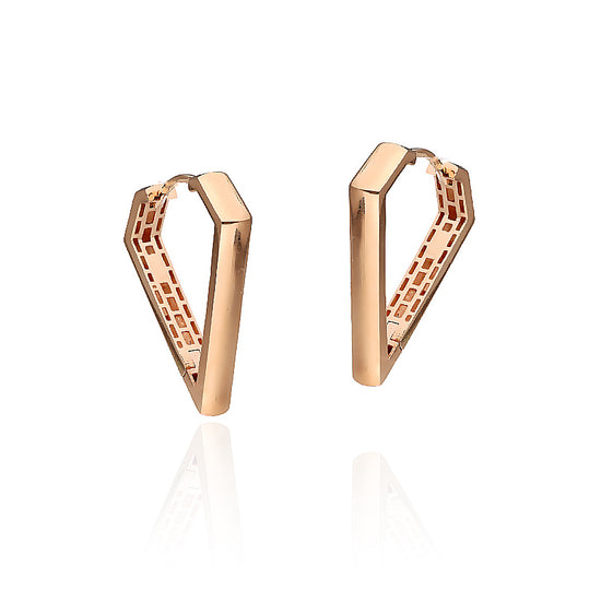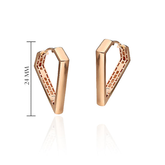 Raudonojo aukso auskarai (24 mm) minimalistinio geometrinio dizaino. Trikampės formos konstrukcija suteikia modernumo ir išskirtinumo, o glotnus paviršius pabrėžia eleganciją. Stilingas pasirinkimas šiuolaikinei moteriai.