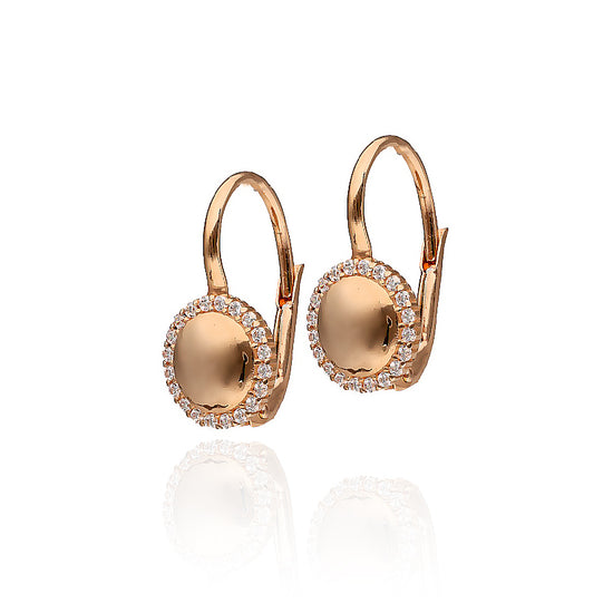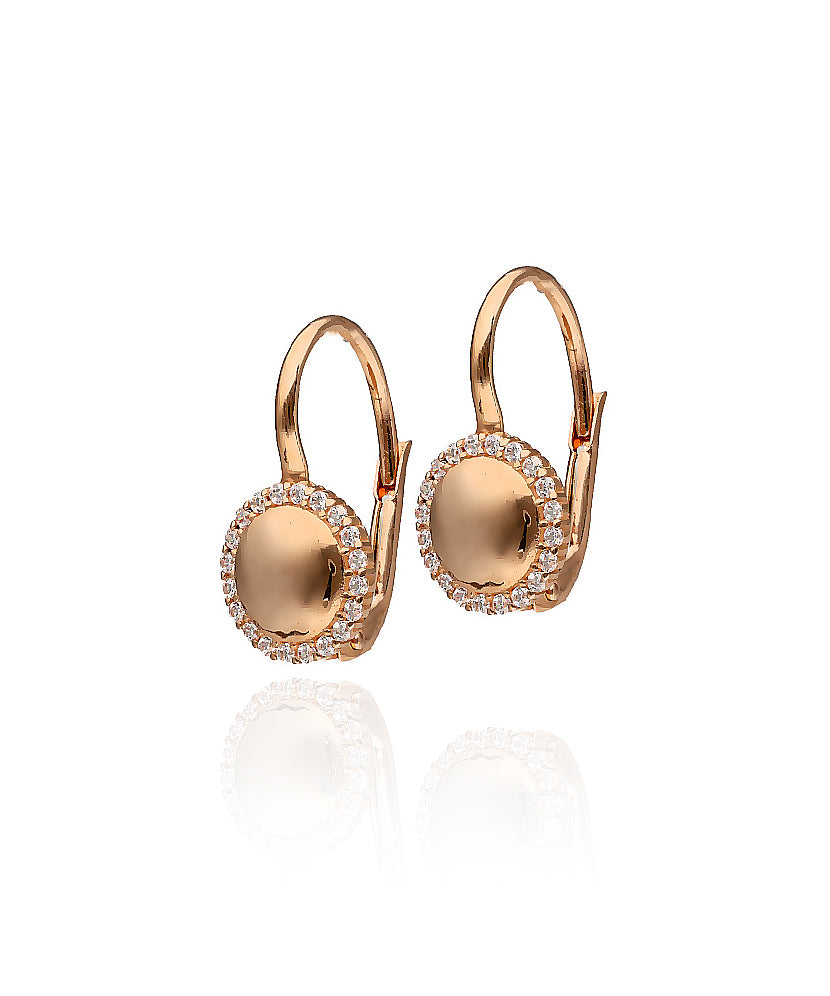 Klasikinio dizaino raudonojo aukso auskarai (18 mm) su apvaliu pakabuku. Centre – lygus auksinis paviršius, apsuptas smulkių cirkonio akmenų vainiku. Subtili elegancija ir spindesys puikiai derės tiek kasdienai, tiek šventėms.