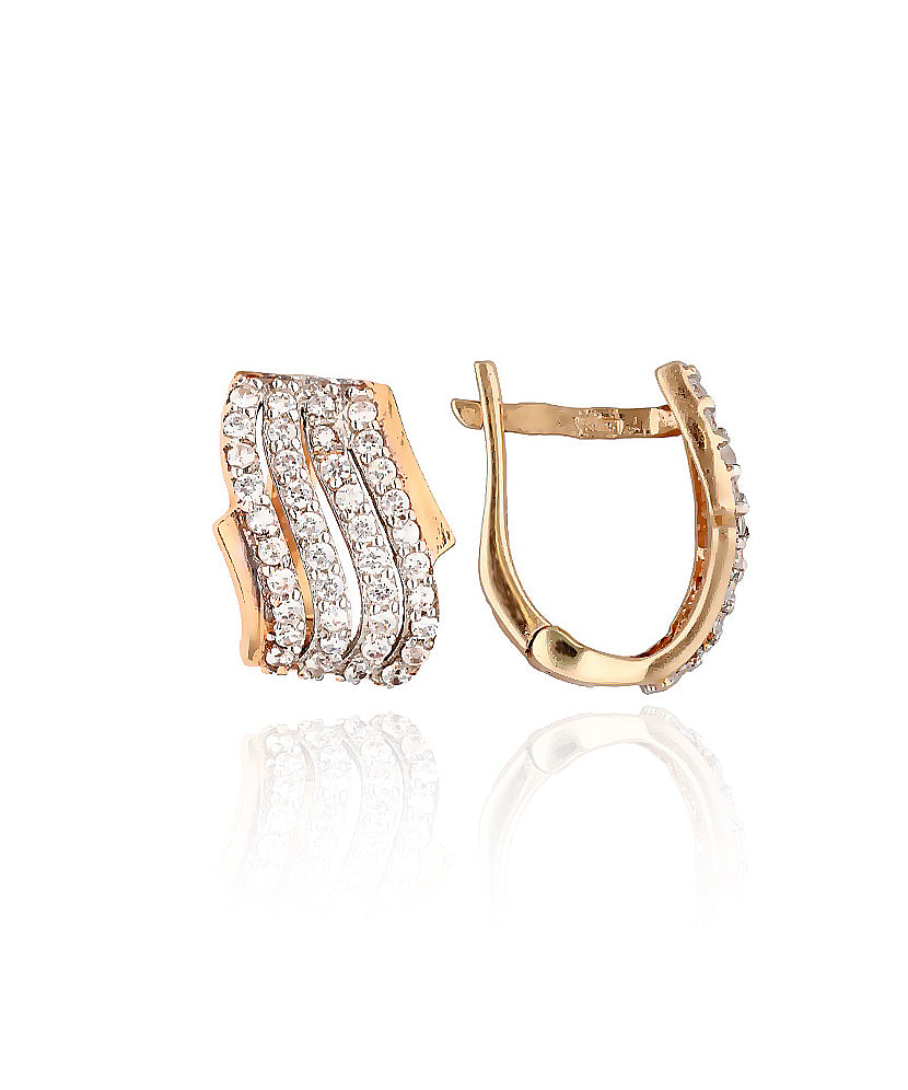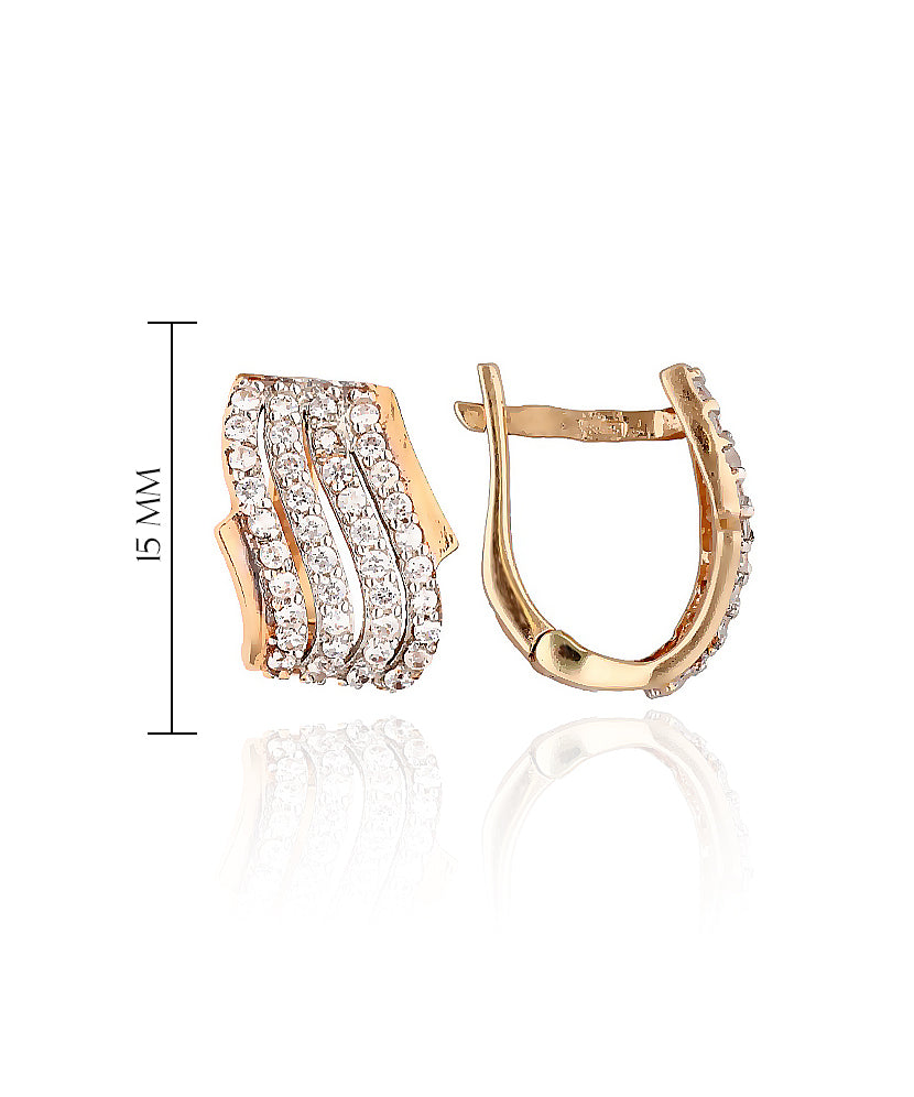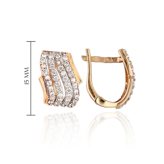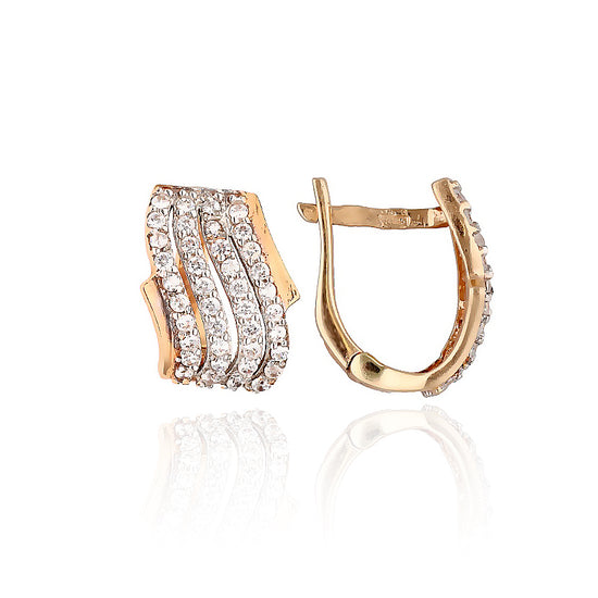 Klasikiniai raudonojo aukso auskarai (15 mm), dekoruoti keliomis banguotomis eilėmis smulkių baltų akmenų. Išraiškingas dizainas sukuria spindesio bangas, suteikiančias prabangos ir elegancijos pojūtį.