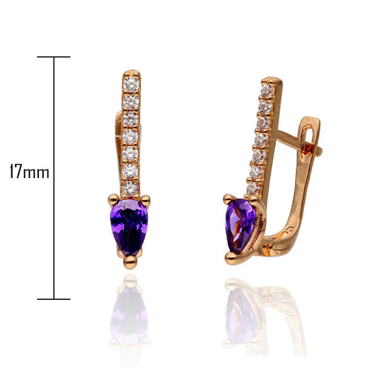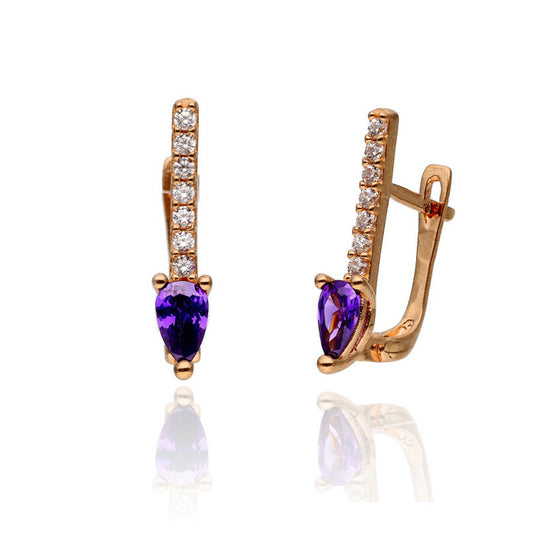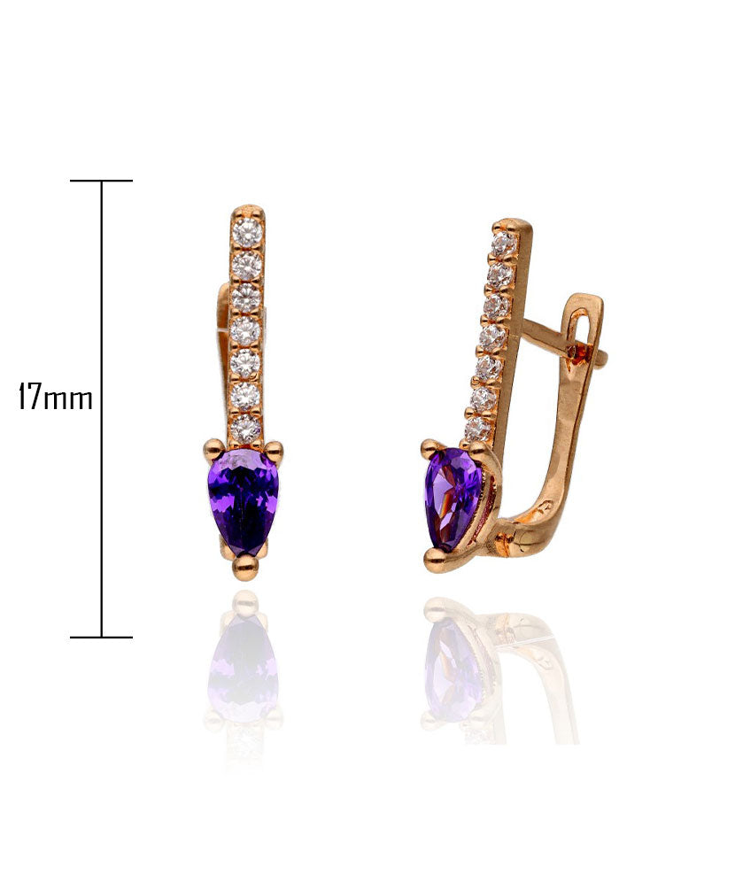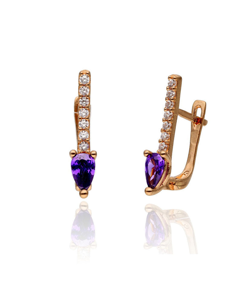 Šie elegantiški auskarai pagaminti iš 585 prabos (14K) raudonojo aukso. Dekoruoti violetinės ir baltos spalvo cirkoniais, amžina klasika, kuri spindi subtilia prabanga. Patogus angliškas užsegimas užtikrina saugų ir patikimą nešiojimą. Gaminio svoris –1,41g.