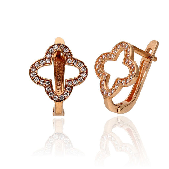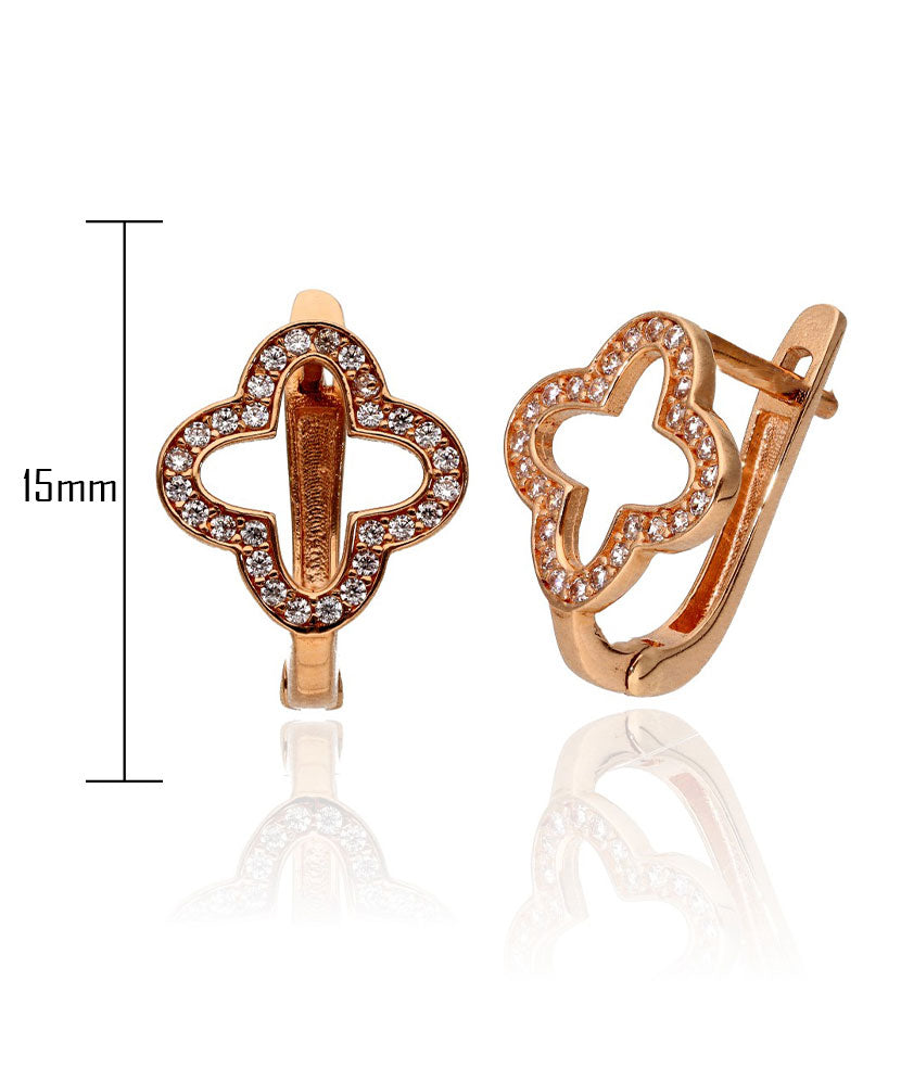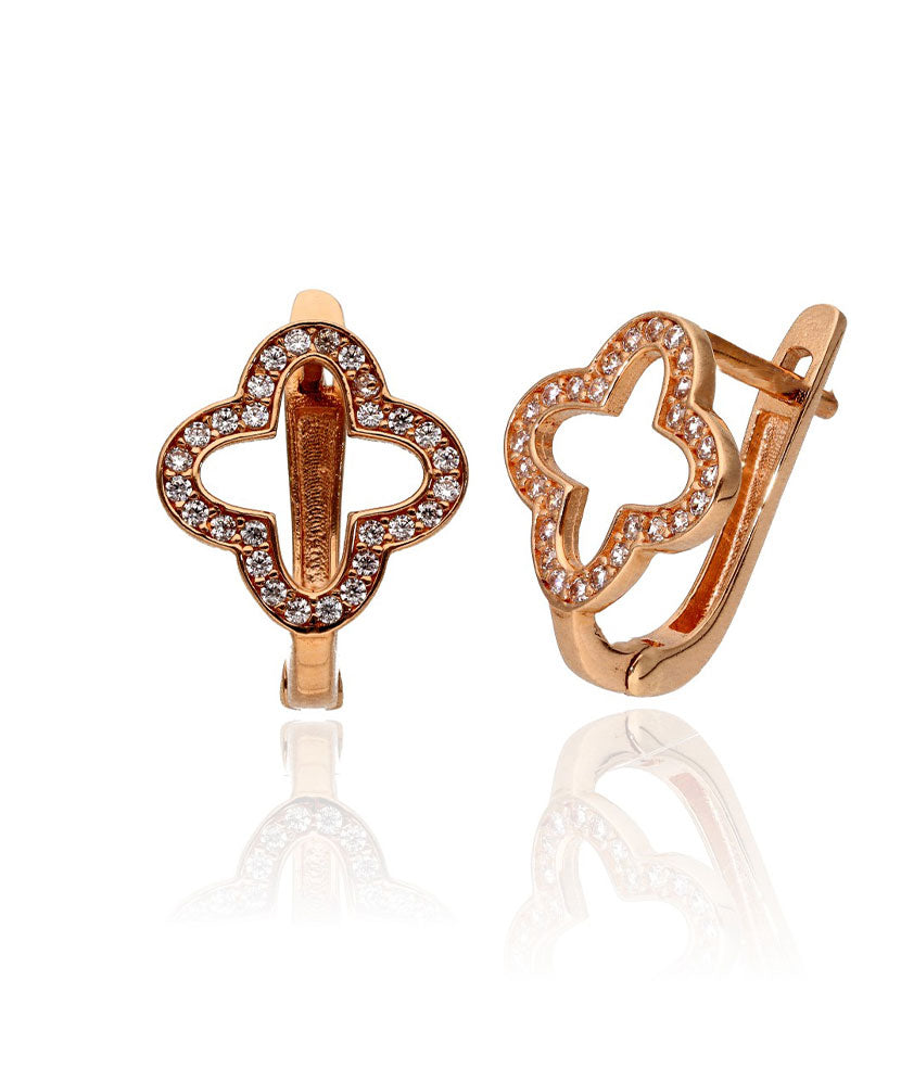 Šie elegantiški auskarai pagaminti iš 585 prabos (14K) raudonojo aukso. Stilingi auskarai su spindinčiais cirkoniais ir atviru dizainu. Patogus angliškas užsegimas užtikrina saugų ir patikimą nešiojimą. Gaminio svoris –3,15g.
