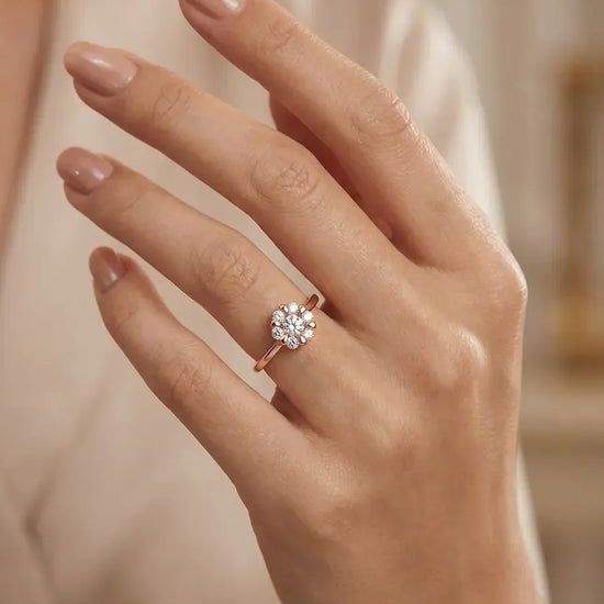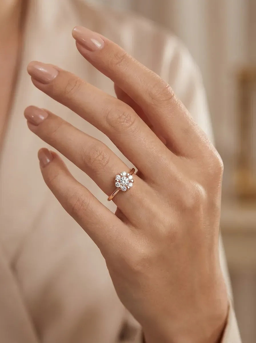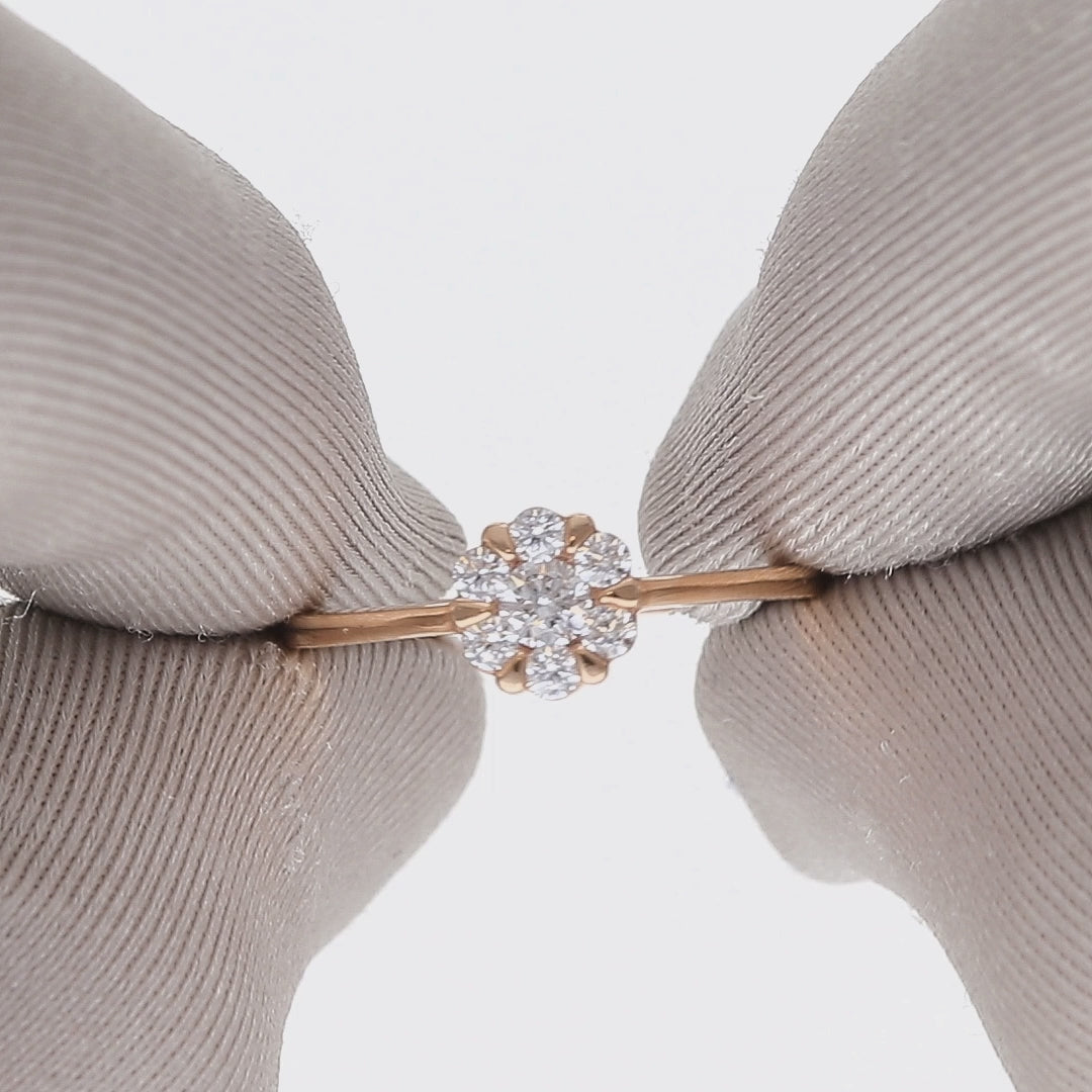 Romantiško dizaino auksinis žiedas su gėlės formos kompozicija. Centre spindintį akmenį supa mažesni akmenėliai, sukuriantys subtilų žiedelio formos efektą ir išskirtinį žavesį.