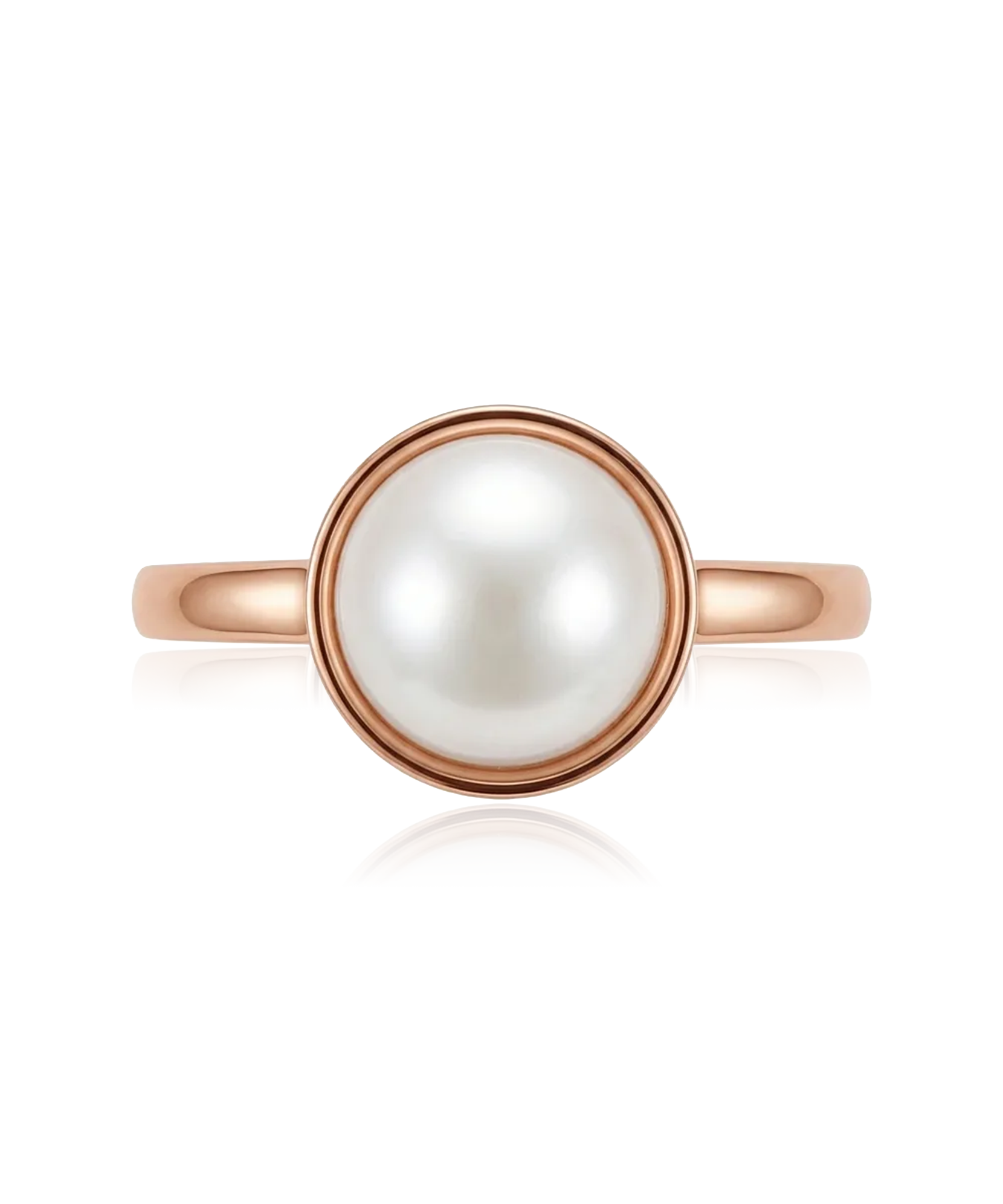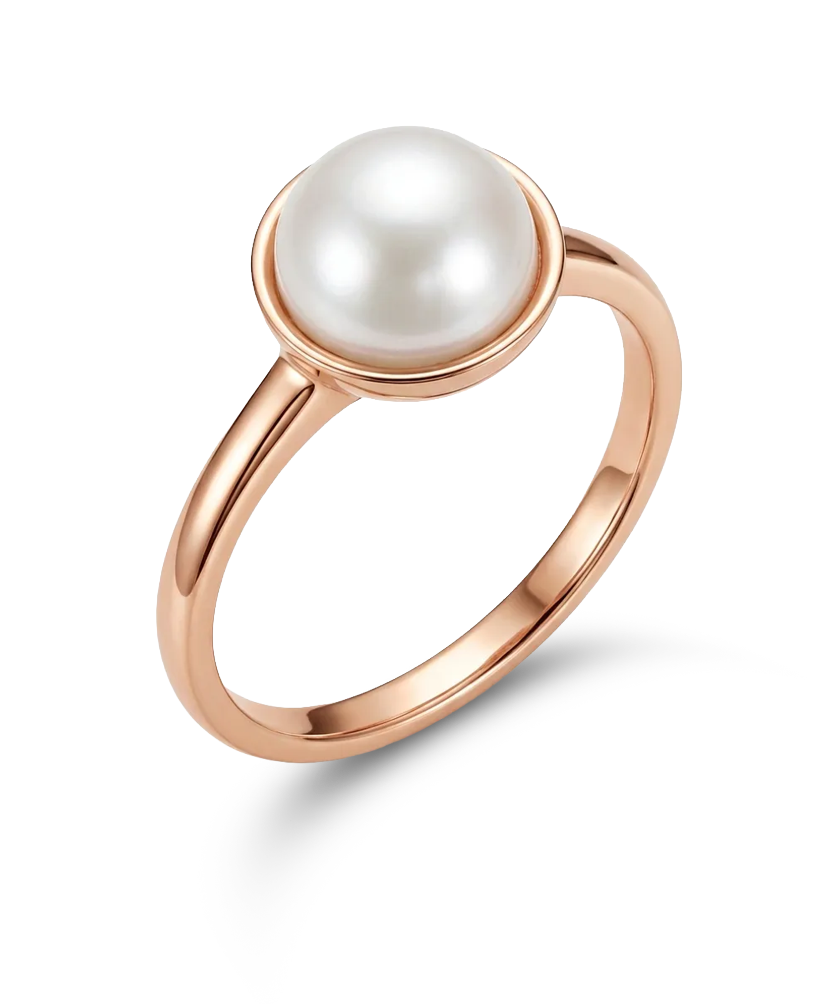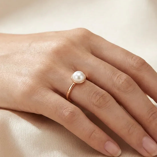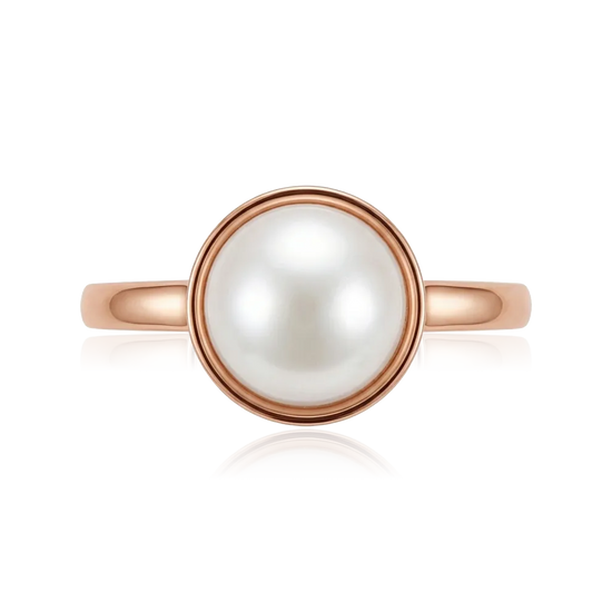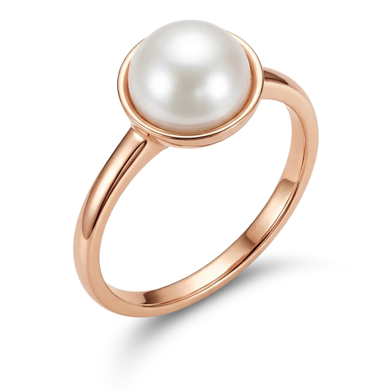 Rausvo aukso žiedas, puoštas subtiliu ir švelniu perlu.