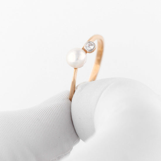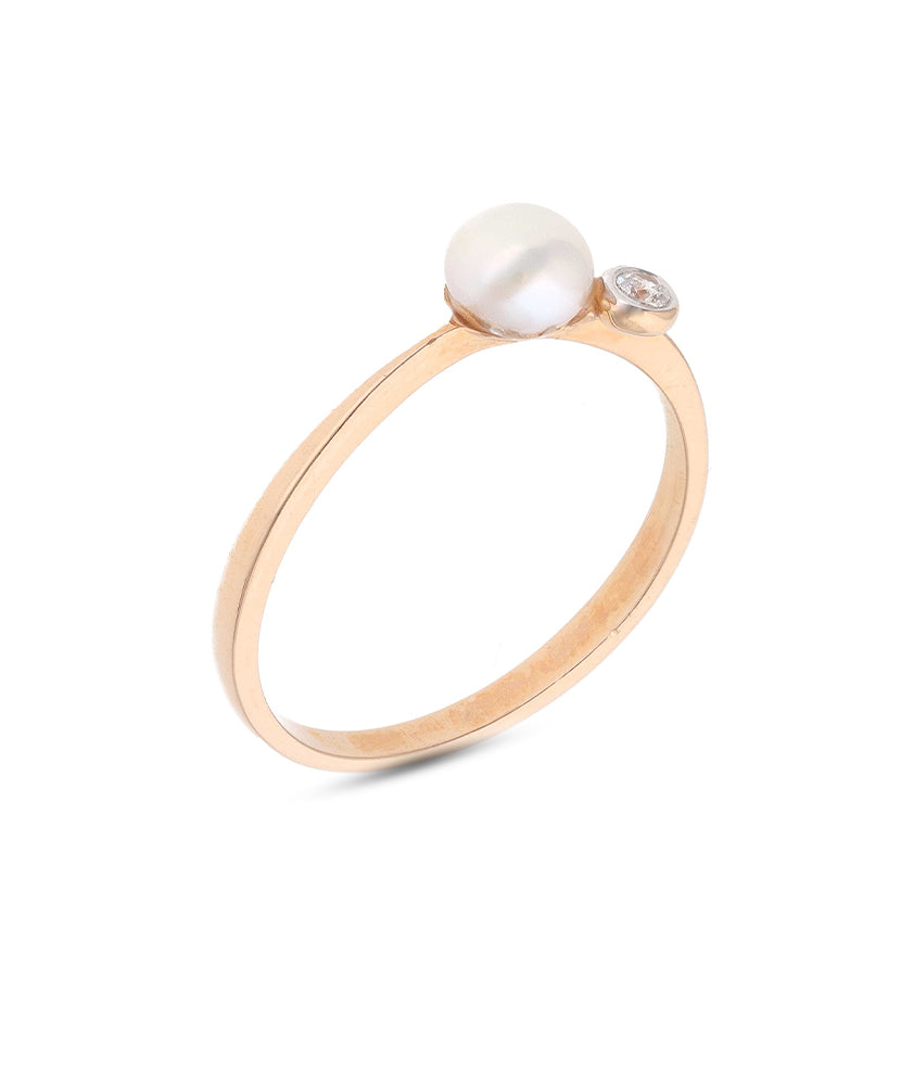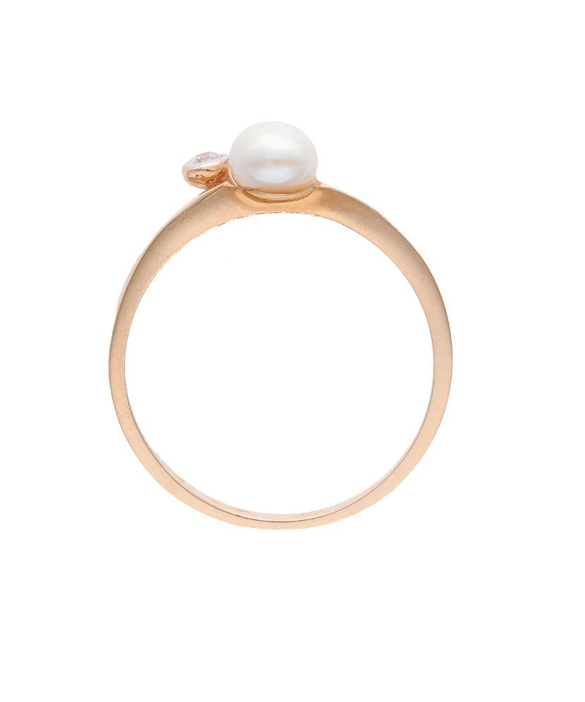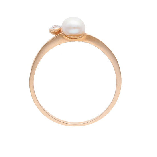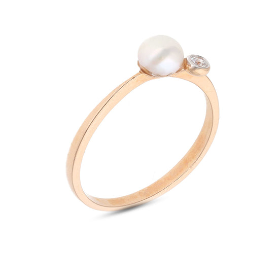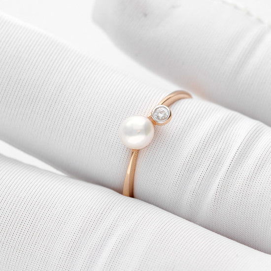 Rausvo aukso žiedas, puoštas subtiliu perlu ir švelniu cirkoniu.