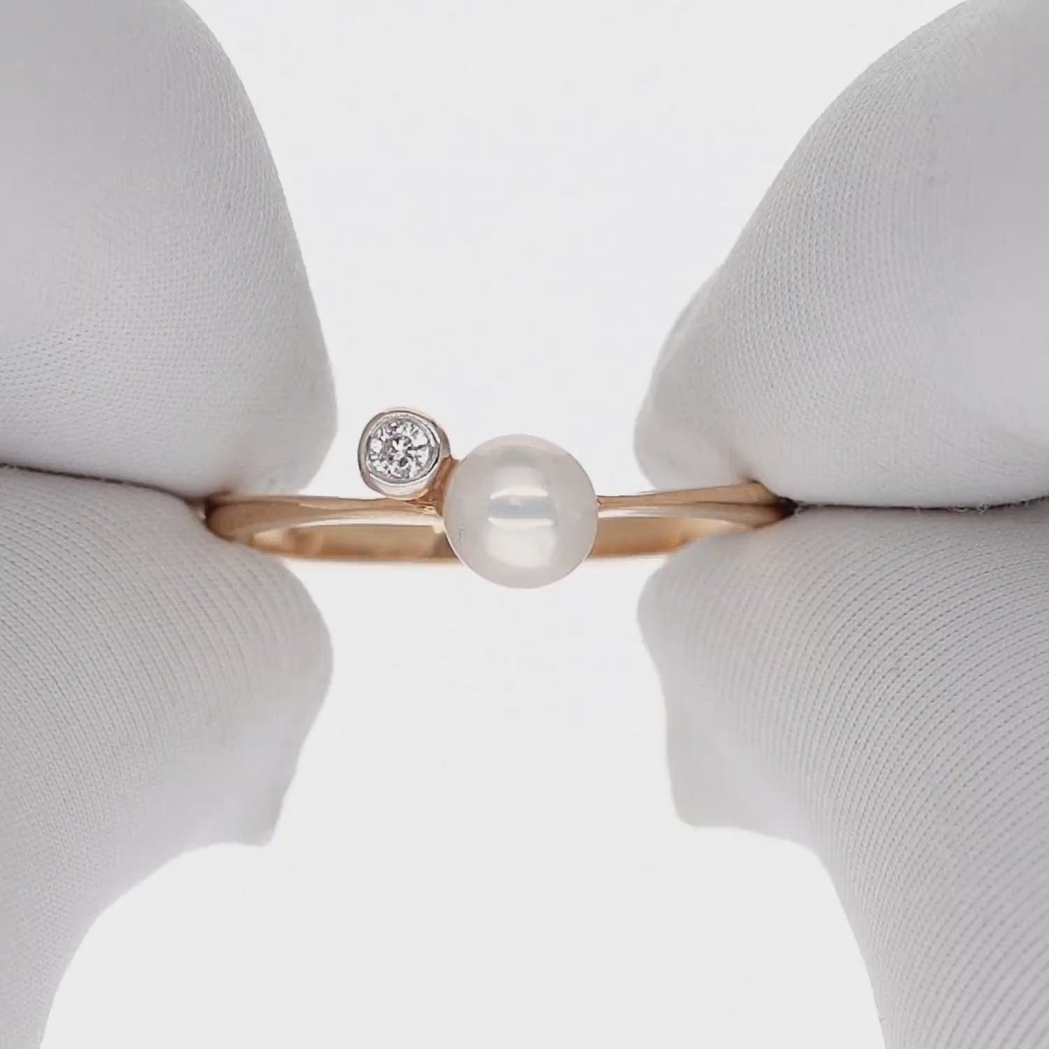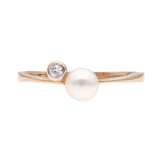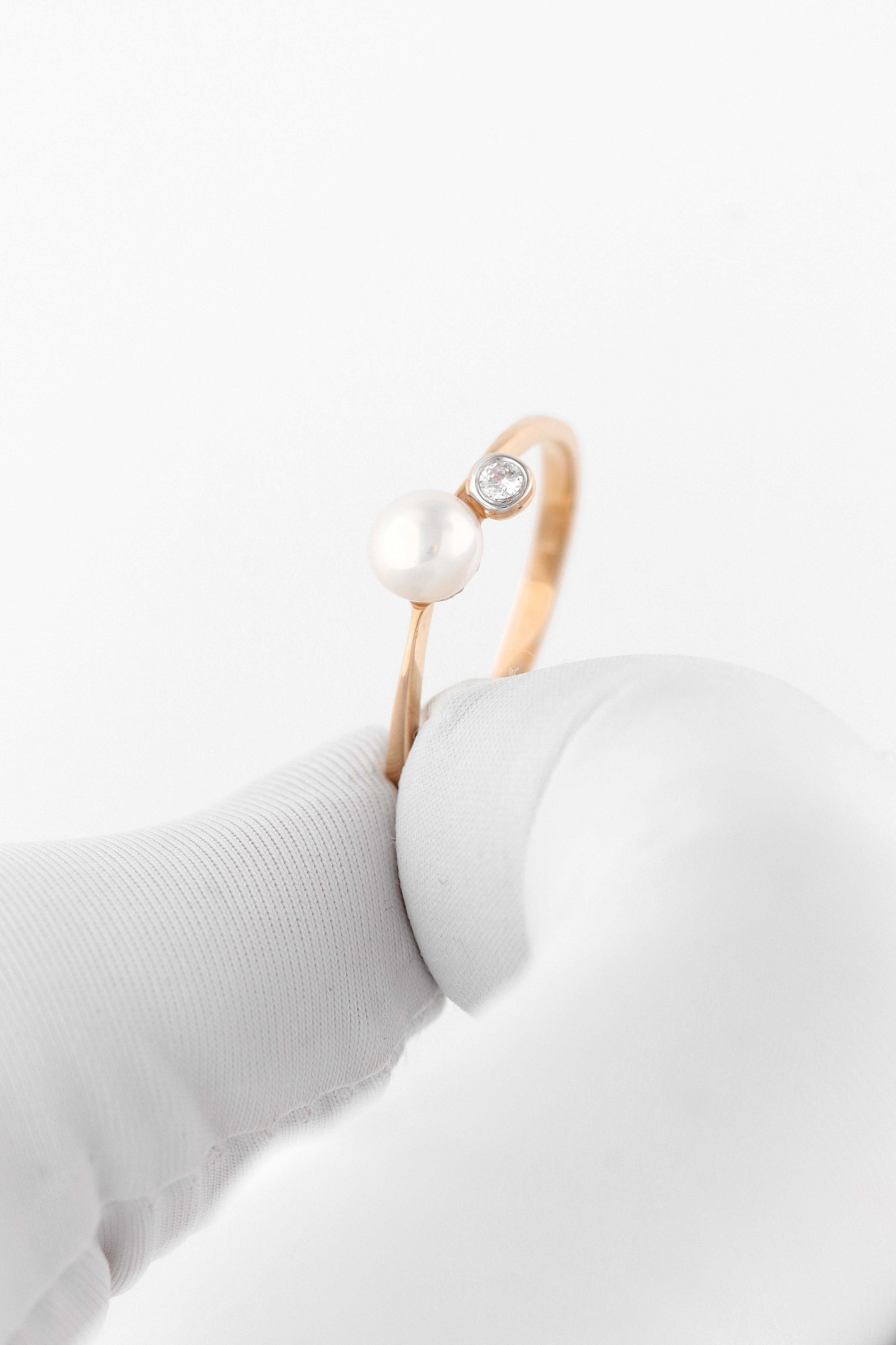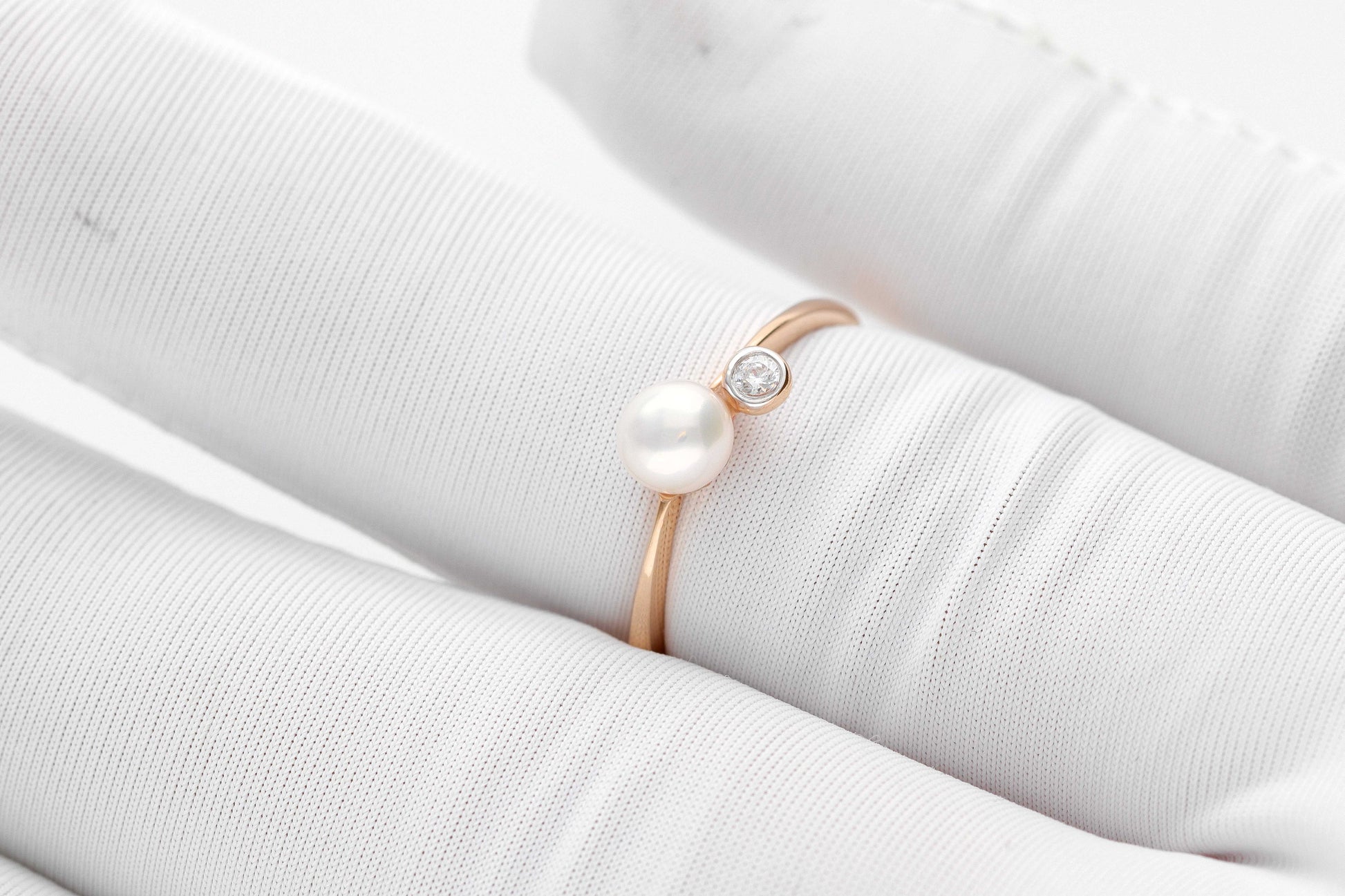 Rausvo aukso žiedas, puoštas subtiliu perlu ir švelniu cirkoniu.