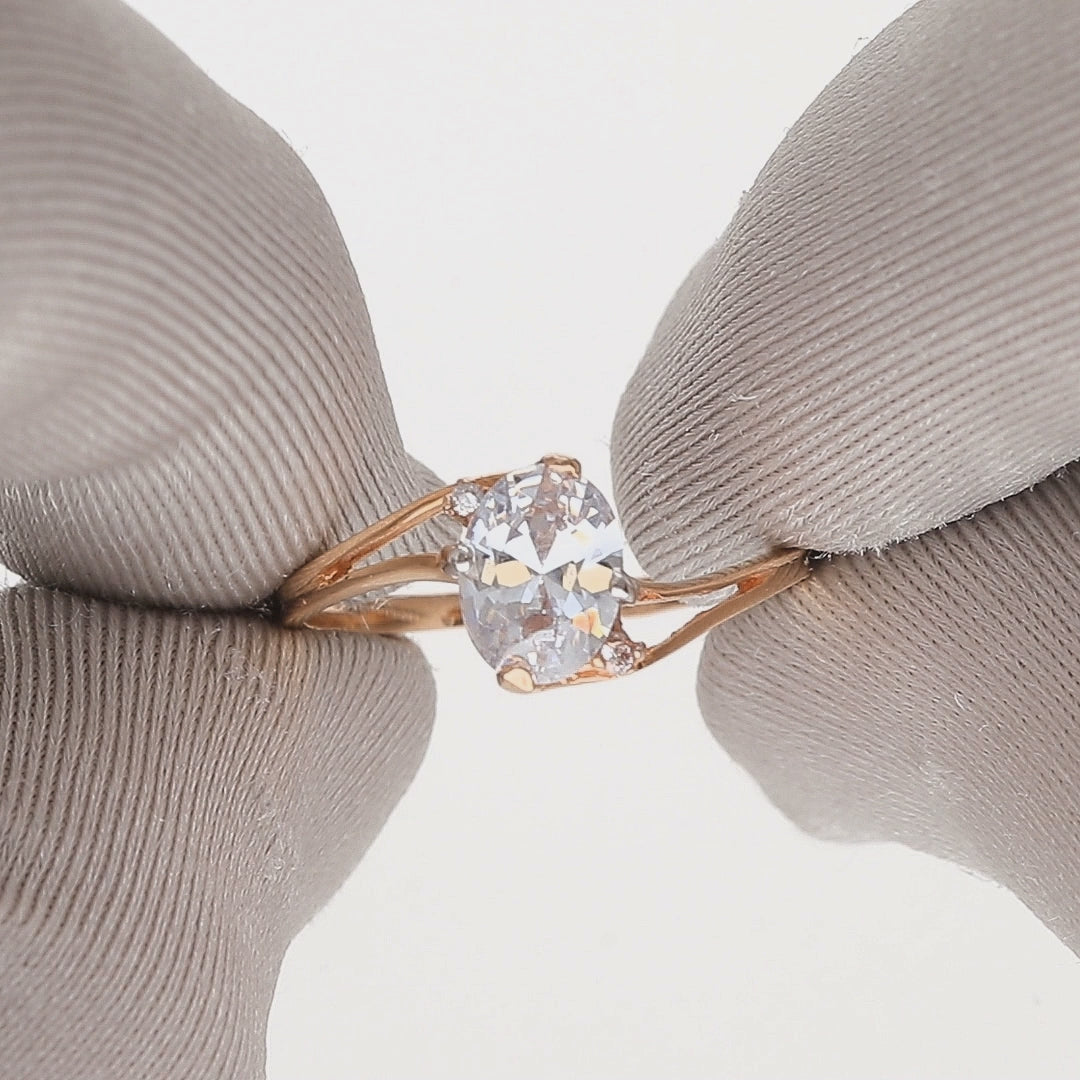 Išskirtinio dizaino raudono aukso žiedas su dideliu, spindinčiu centriniu akmeniu. Subtilūs šoniniai akcentai su mažais akmenėliais suteikia papildomo žavesio ir elegancijos.