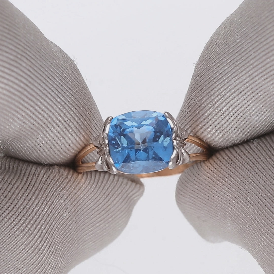 Išskirtinio dizaino raudono aukso žiedas, dekoruotas stambiu, sodrios mėlynos spalvos cirkoniu. Akmens spindesį subtiliai pabrėžia balto aukso detalės, suteikiančios papuošalui prabangos ir elegancijos.