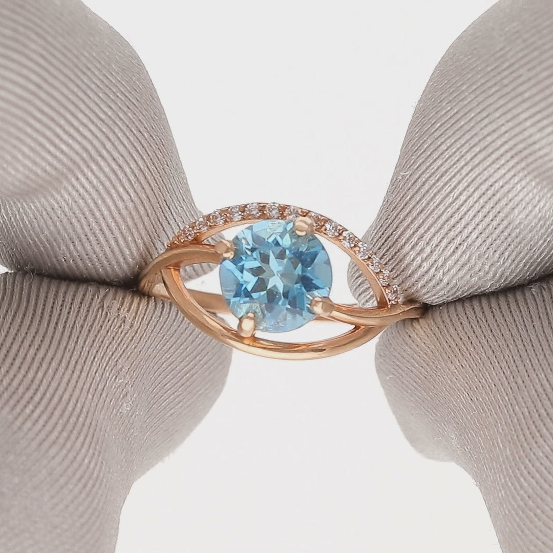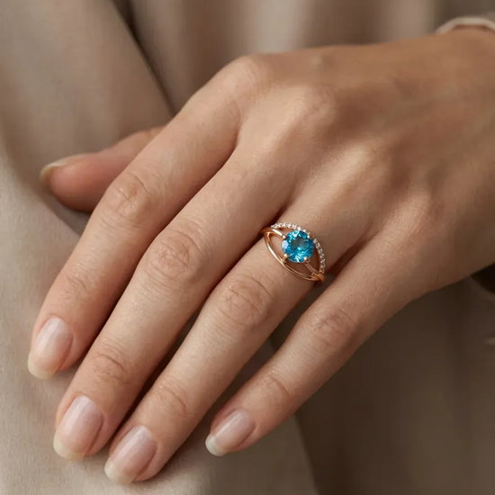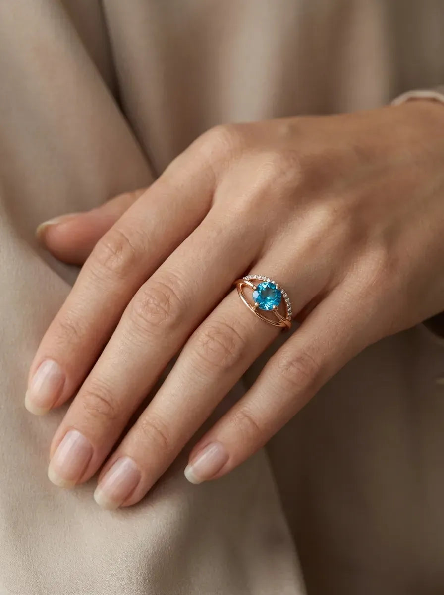 Išskirtinis raudono aukso žiedas su ryškiu, sodrios mėlynos spalvos cirkoniu centre. Akmenį subtiliai papildo smulkūs cirkoniai, suteikiantys papildomo spindesio ir prabangos įspūdį.
