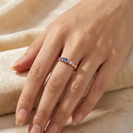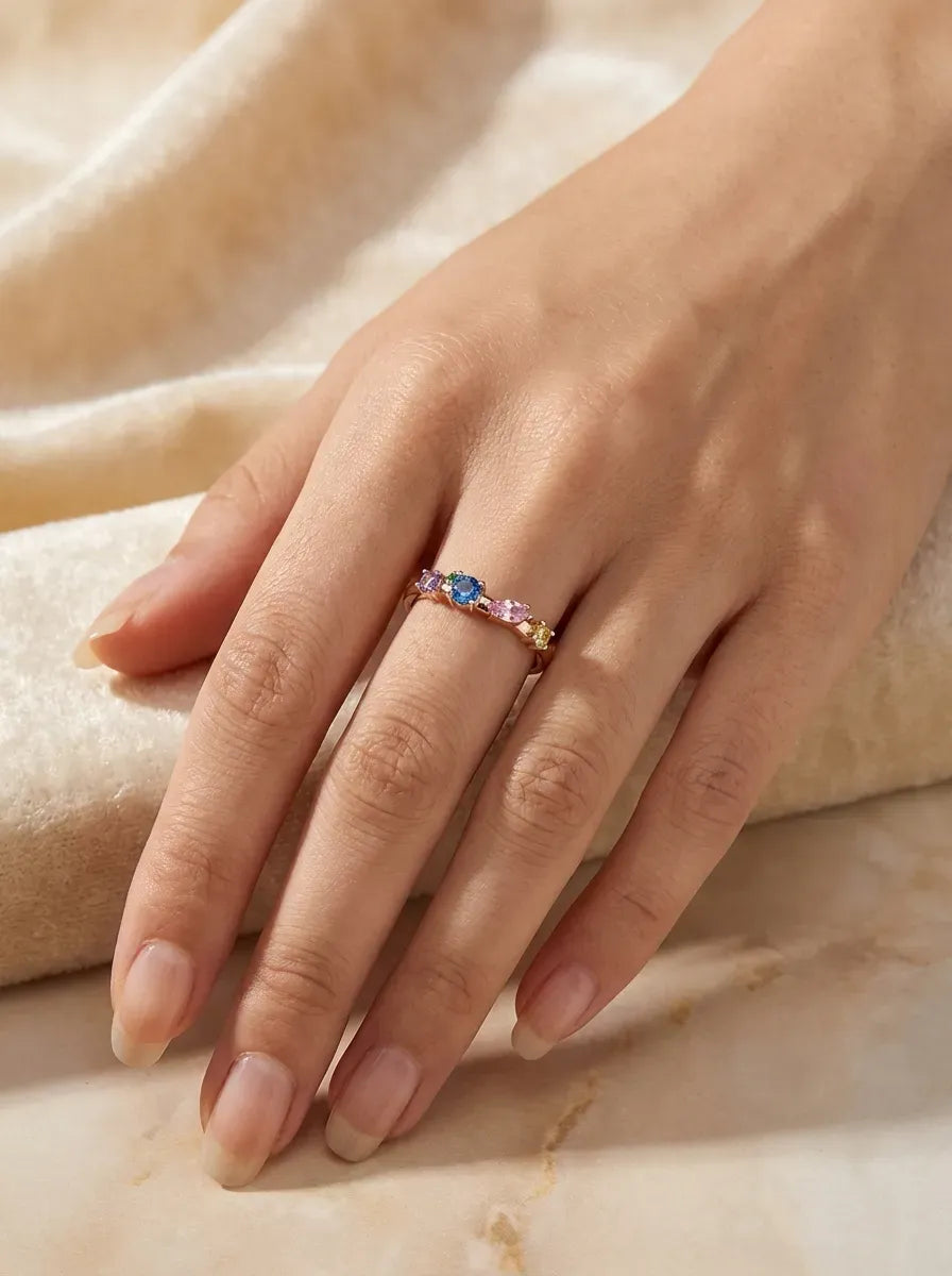Išskirtinis raudono aukso žiedas, puoštas spalvingais akmenimis – mėlynu, rožiniu, geltonu, violetiniu ir žaliu akcentu. Žaismingas, tačiau elegantiškas dizainas suteikia papuošalui gyvybingumo ir unikalumo.