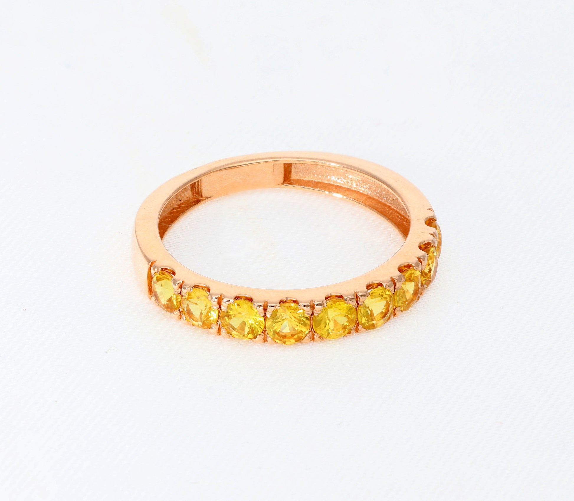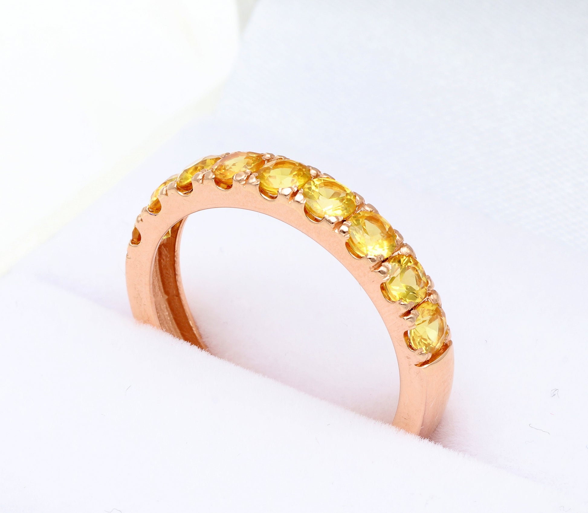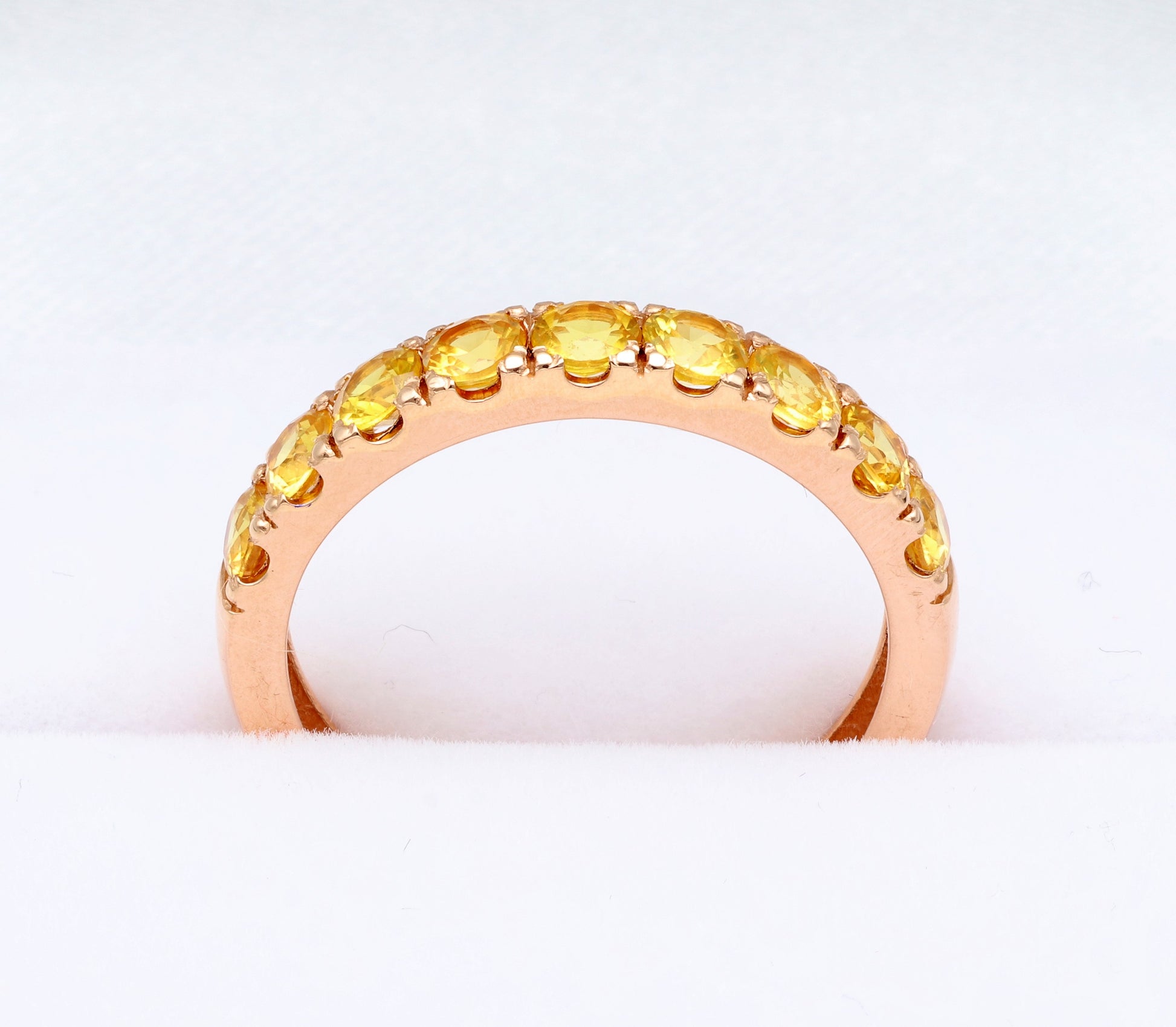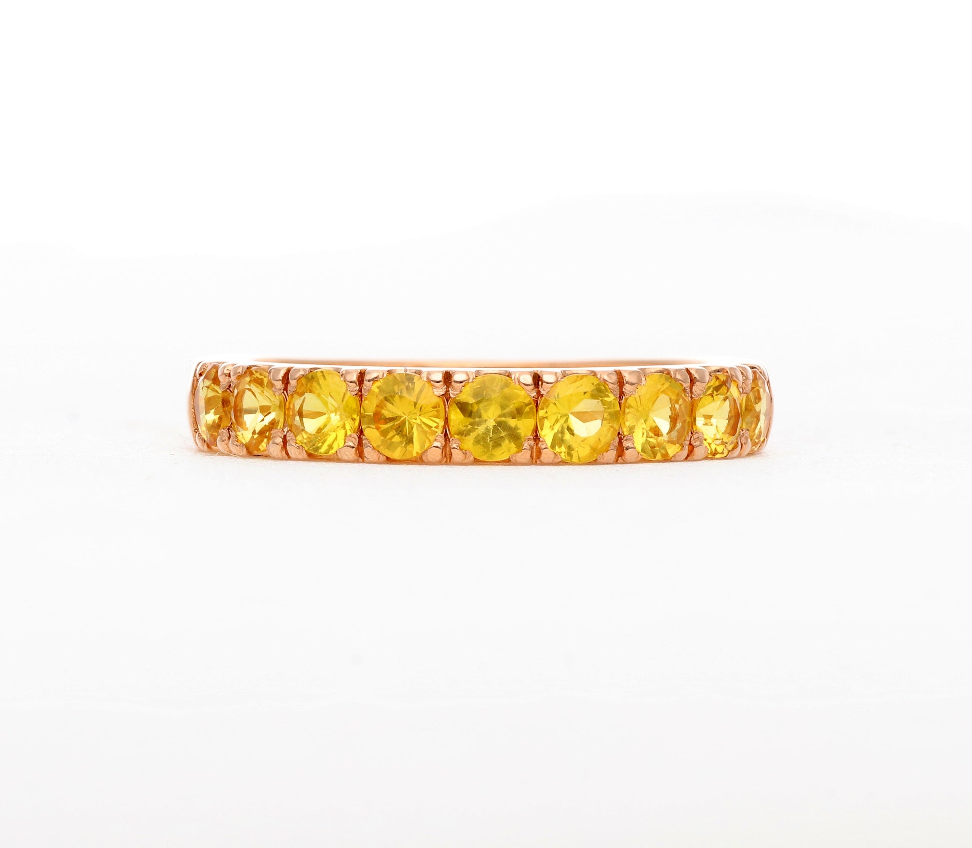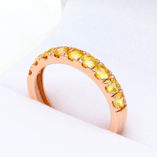 Raudono aukso „Half Eternity“ žiedas su 3 mm geltonais safyrais. Pusę žiedo juosianti safyrų juostelė spindi saulės šviesa, suteikdama papuošalui išskirtinės šilumos ir elegancijos.