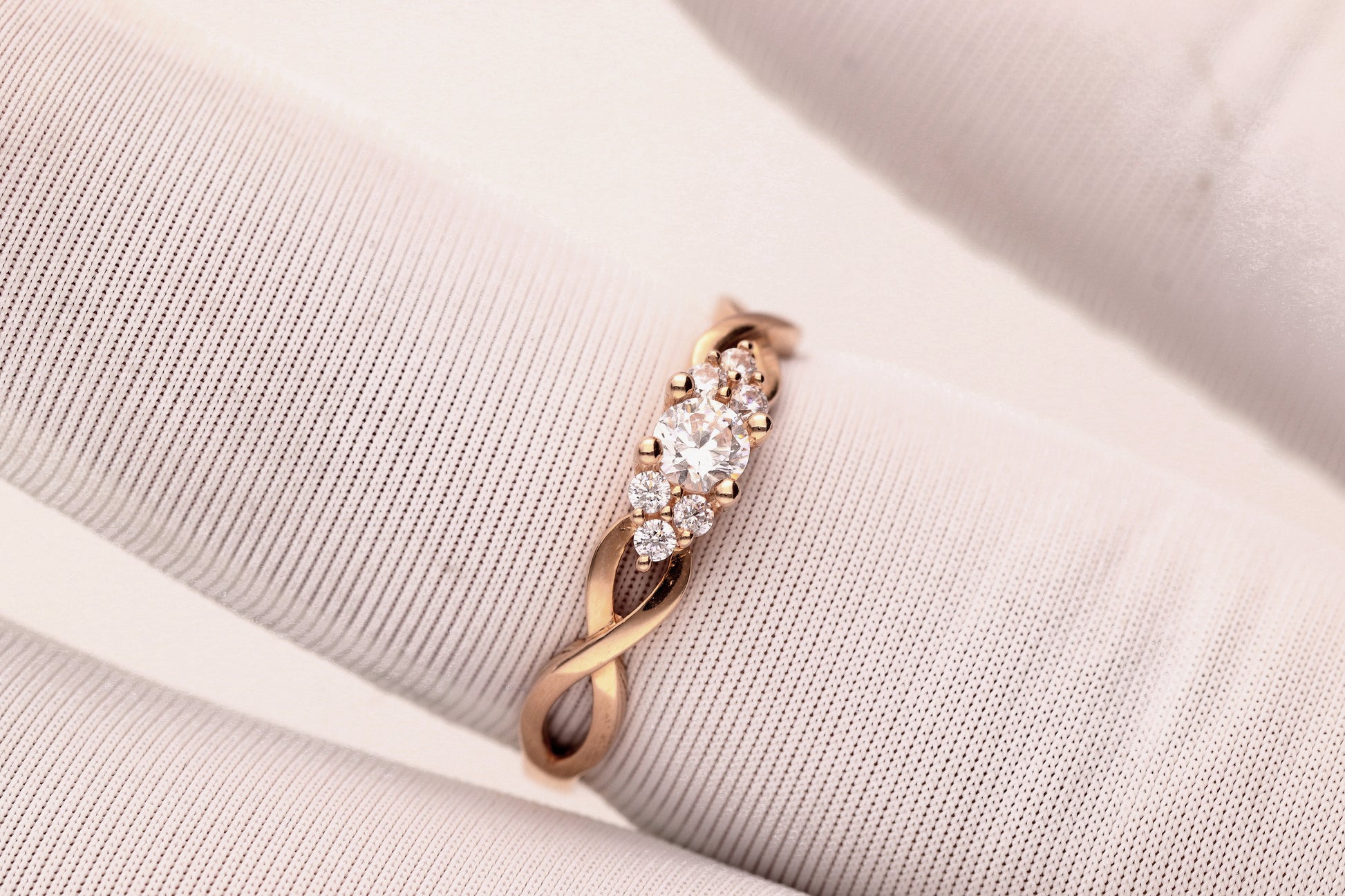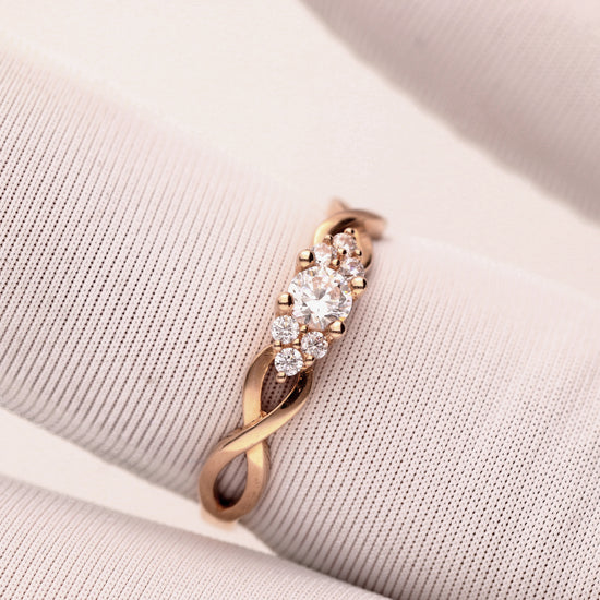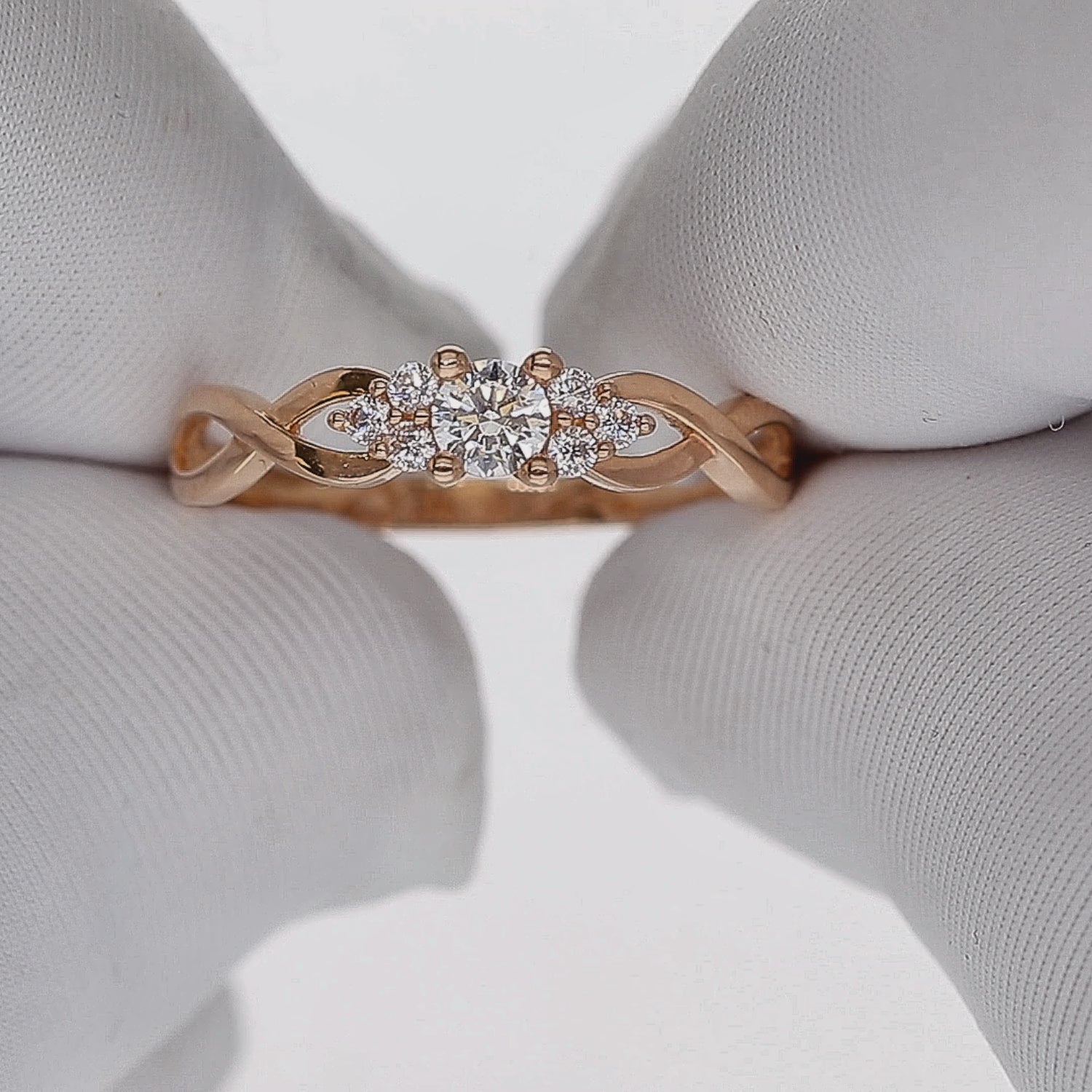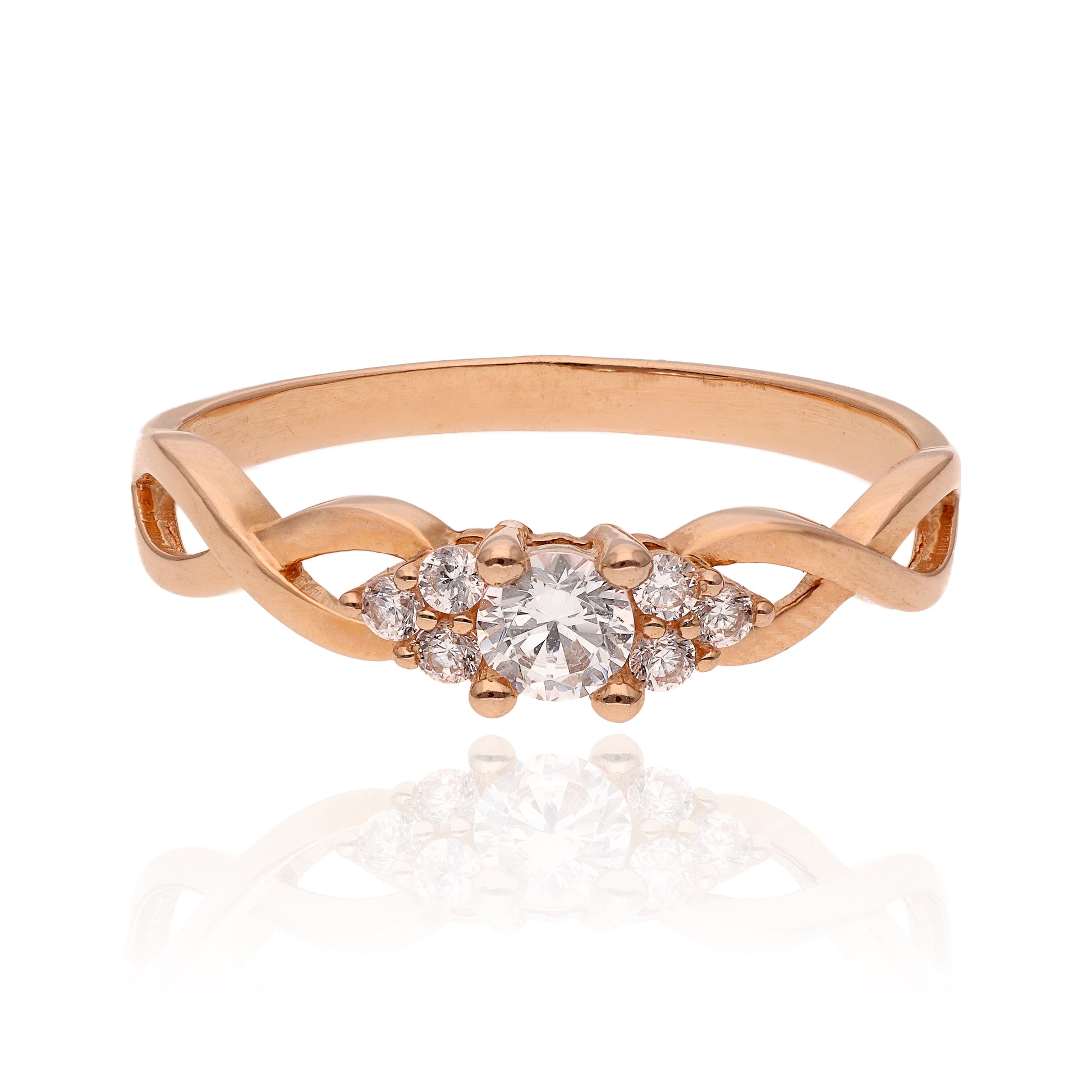 Subtilus raudono aukso žiedas su įpintu dizainu ir švytinčiais baltais cirkoniais. Centrinis akmuo išryškintas mažesniais cirkoniais, kurie suteikia kompozicijai švelnų spindesį. Žiedas dvelkia romantika ir elegancija – puikus pasirinkimas moteriai, vertinančiai švelnumą ir klasikinį grožį.