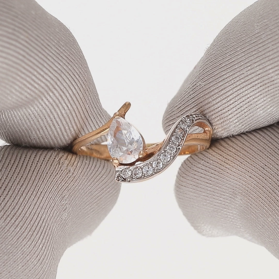 Elegantiškas ir išskirtinio dizaino raudono aukso žiedas, puoštas stambiu centriniu cirkoniu bei smulkiais cirkoniais dekoruota lenkta detale. Dviejų atspalvių dizainas suteikia modernumo ir prabangos pojūtį.