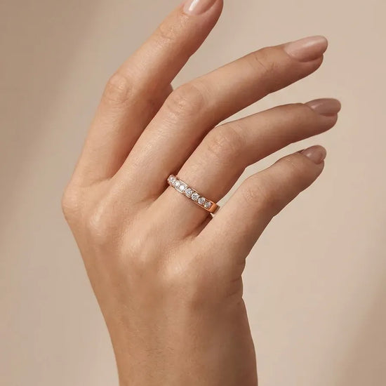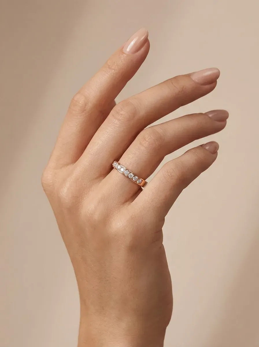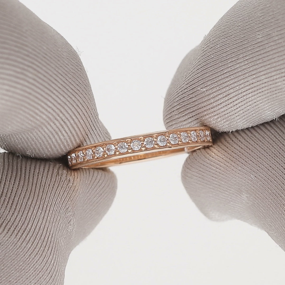 Elegantiško ir subtilaus dizaino raudono aukso žiedas, dekoruotas viena eile kruopščiai inkrustuotų cirkonių. Švelniai išlenkta forma ir tvarkingas akmenų išdėstymas suteikia papuošalui išskirtinio spindesio bei prabangos pojūtį.