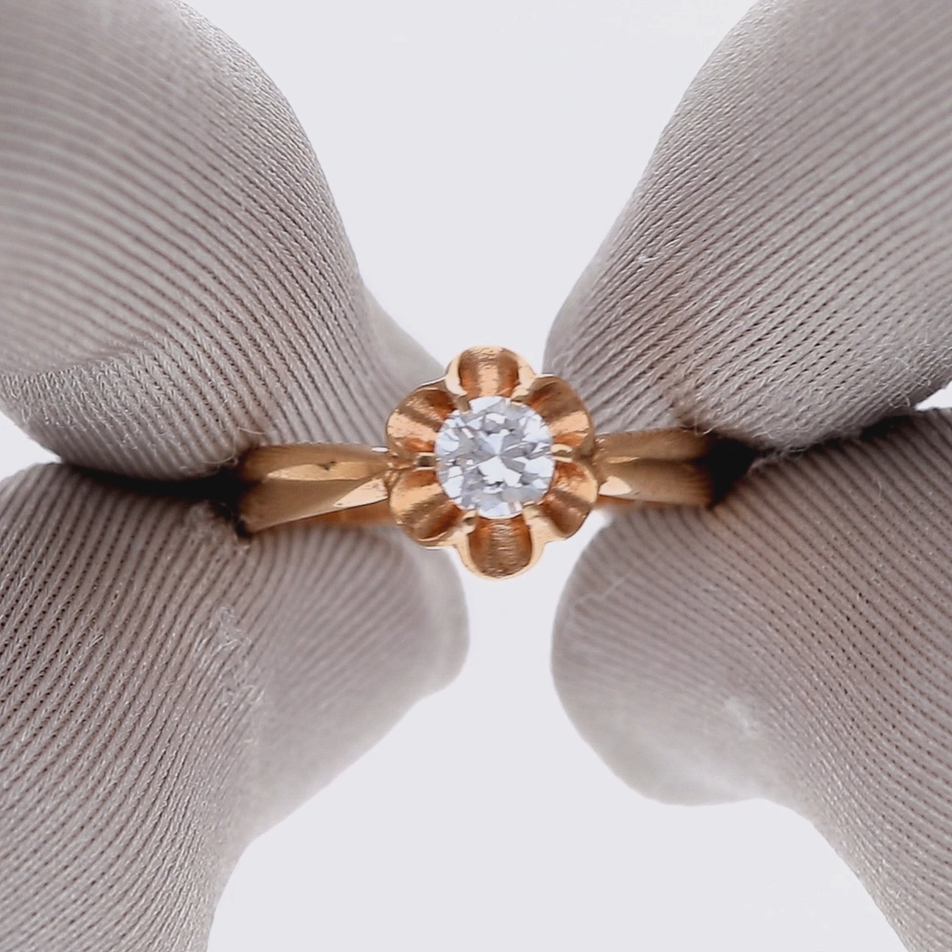 Elegantiškas ir subtilaus dizaino raudono aukso žiedas su centriniu cirkoniu. Klasikinę formą papildo švelniai banguotas apvadas, suteikiantis papuošalui išskirtinumo ir romantikos pojūtį.