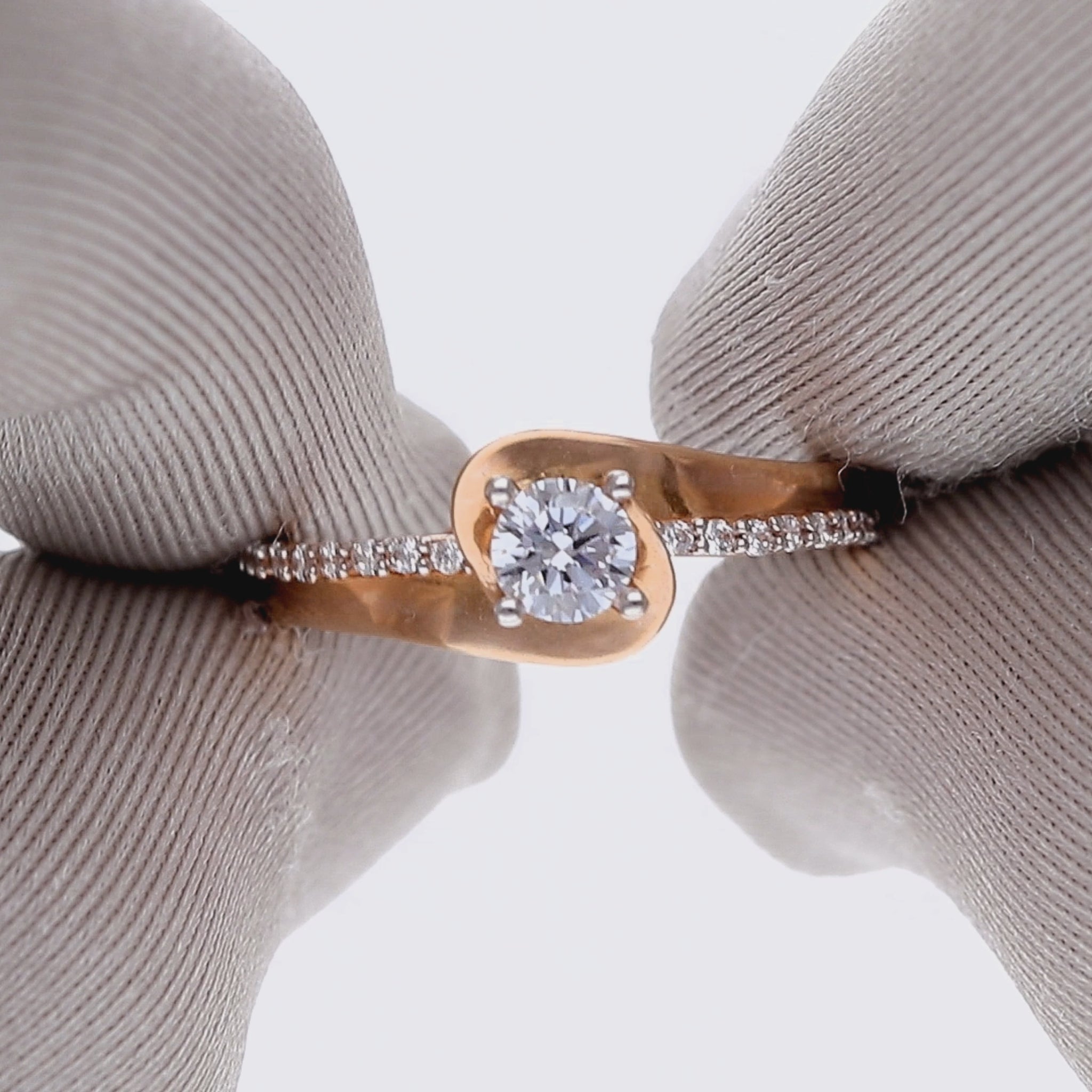 Prabangus ir išskirtinio dizaino raudono aukso žiedas su centriniu cirkoniu, kurį elegantiškai papildo smulkūs briliantai žiedo šonuose. Moderni, lengvai asimetriška forma suteikia papuošalui subtilaus išskirtinumo ir prabangos pojūtį.