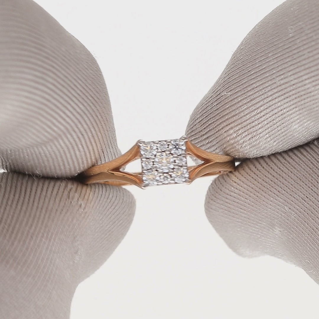 Subtilus ir elegantiškas raudono aukso žiedas, puoštas spindinčia cirkonių kompozicija. Kvadratinės formos akmenų išdėstymas suteikia žiedui išskirtinumo ir prabangos įspūdį, o lengvai išlenkta juostelė pabrėžia modernų dizainą.