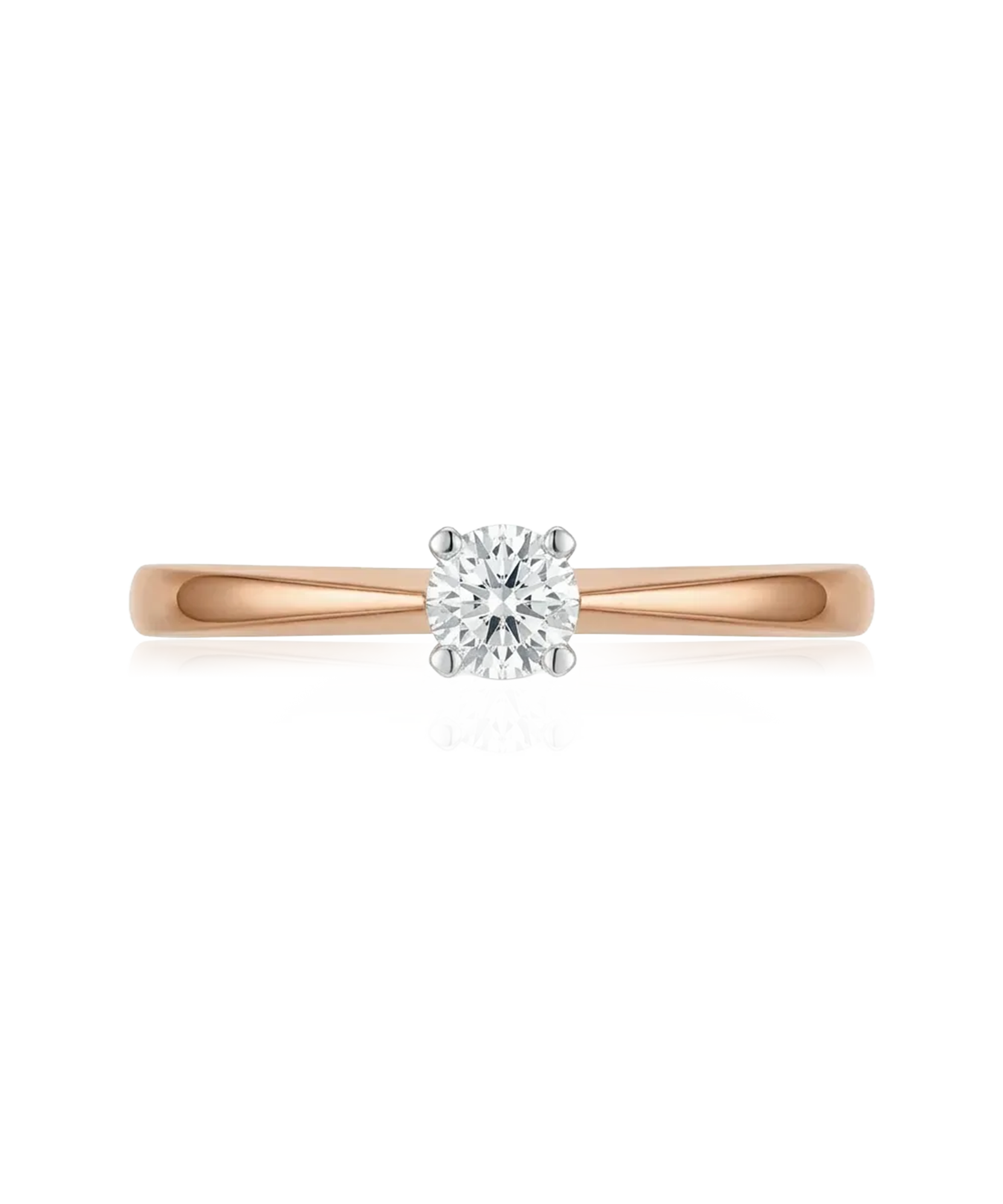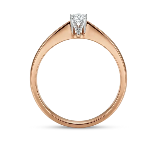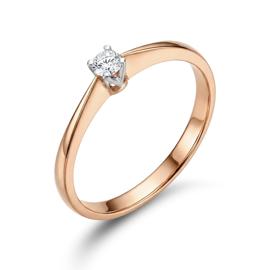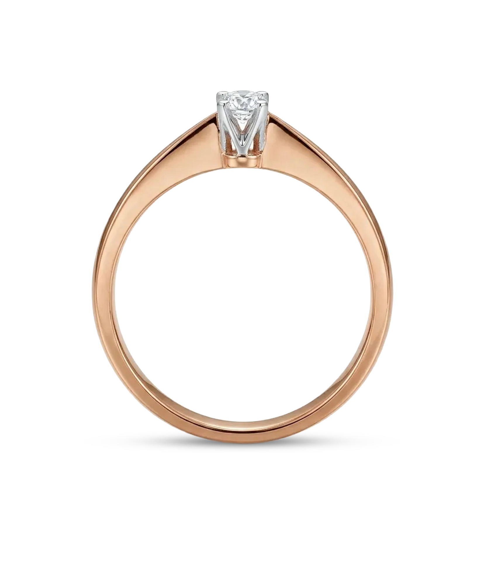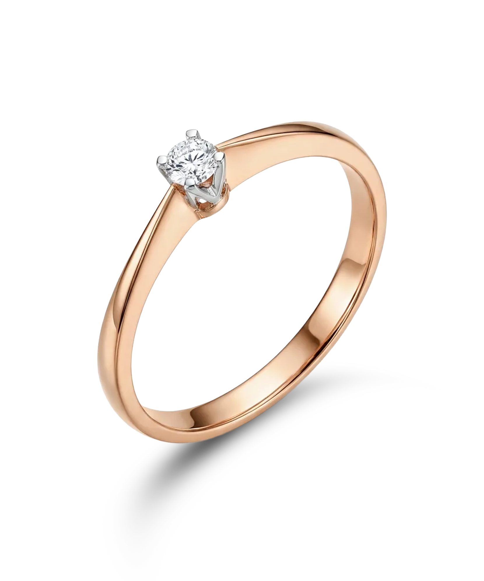 Rausvo ir balto aukso žiedas su briliantu – šiuolaikinės elegancijos simbolis. Jo subtilus dizainas atskleidžia tobulą balansą tarp šilumos ir rafinuoto spindesio.