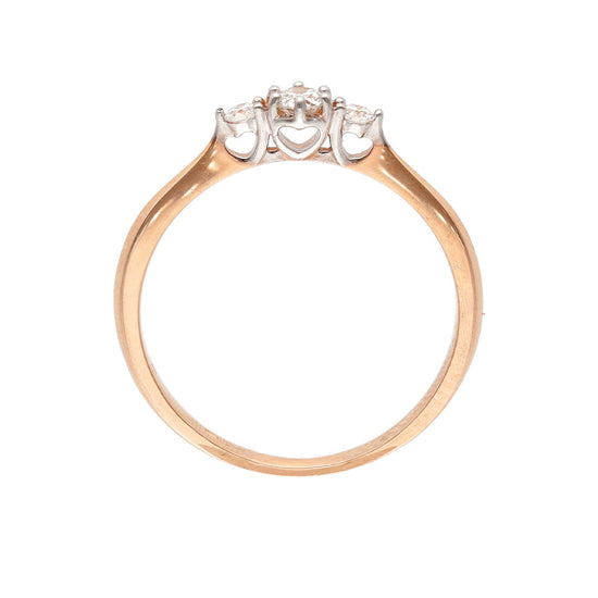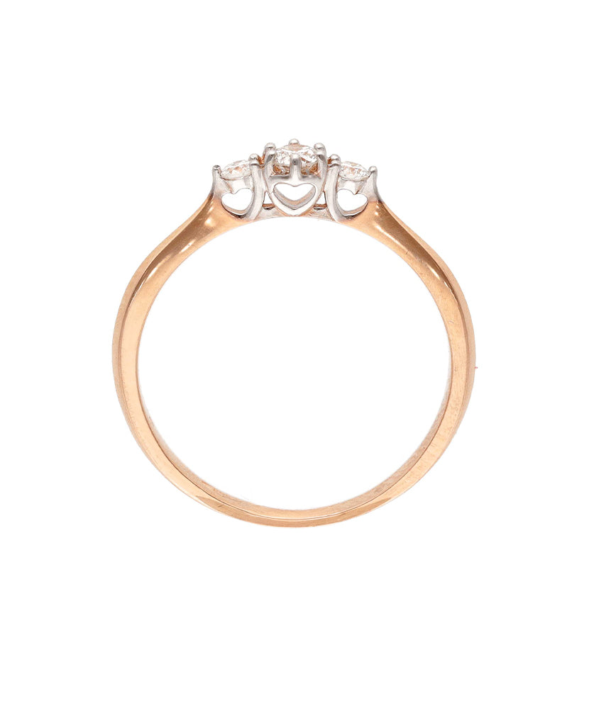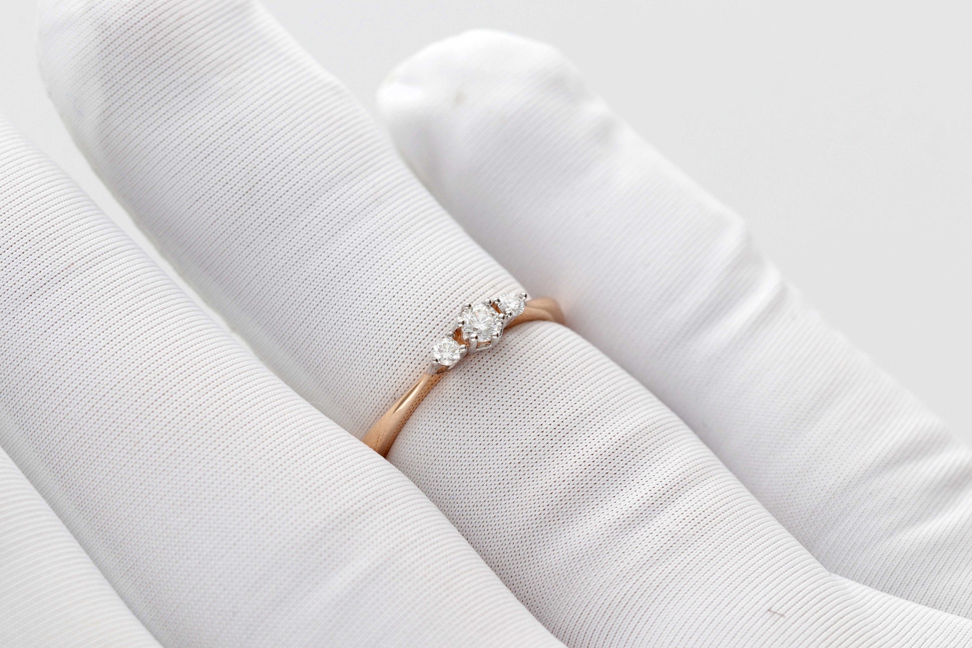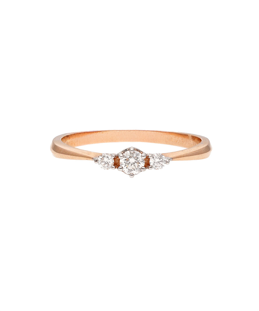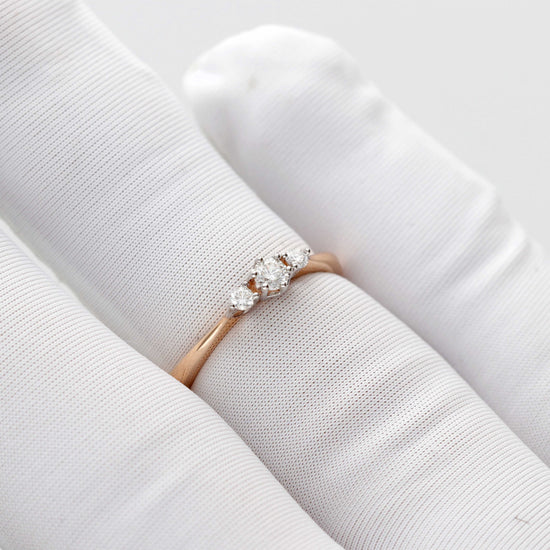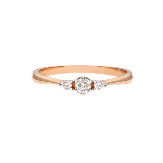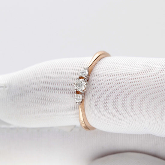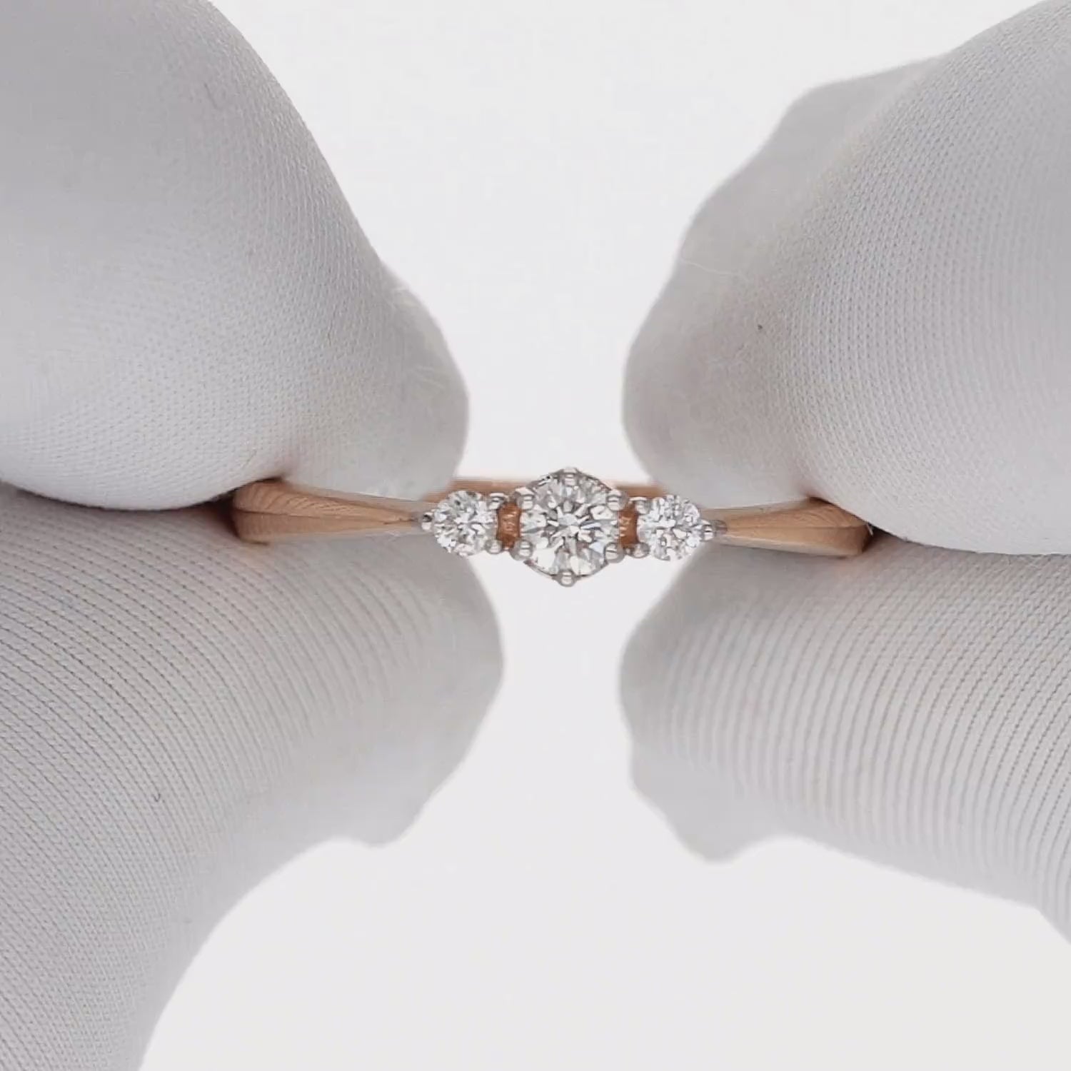 Minimalistinio dizaino rausvo aukso žiedas su trimis deimantais išsiskiria šiuolaikiška elegancija. Kiekvienas akmuo kruopščiai parinktas, kad sukurtų tobulą balansą tarp šviesos ir stiliaus.