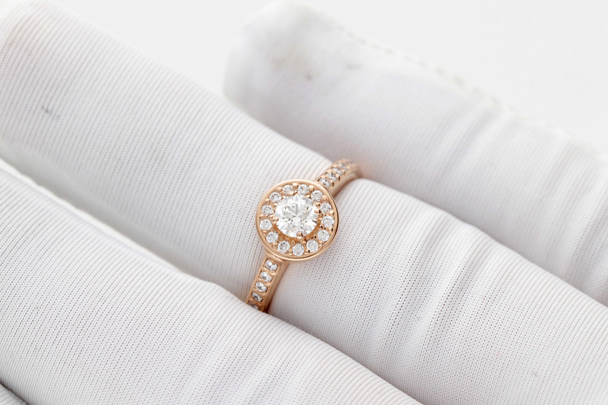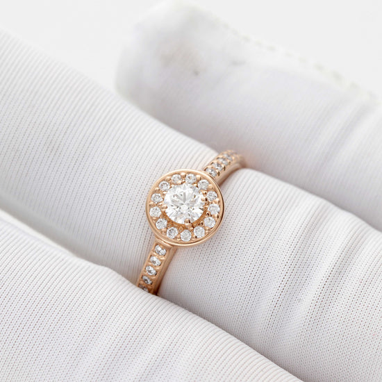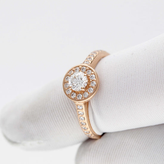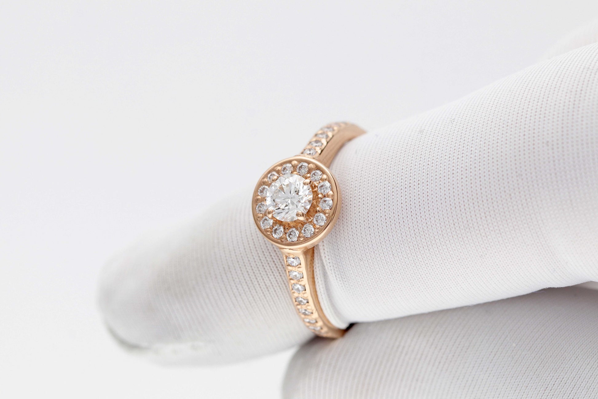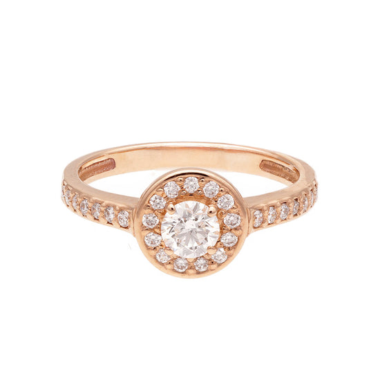Rausvo aukso žiedas su deimantais – subtilios prabangos akcentas. Šis žiedas spindi elegancija ir tinka tiek kasdienai, tiek ypatingoms progoms.
