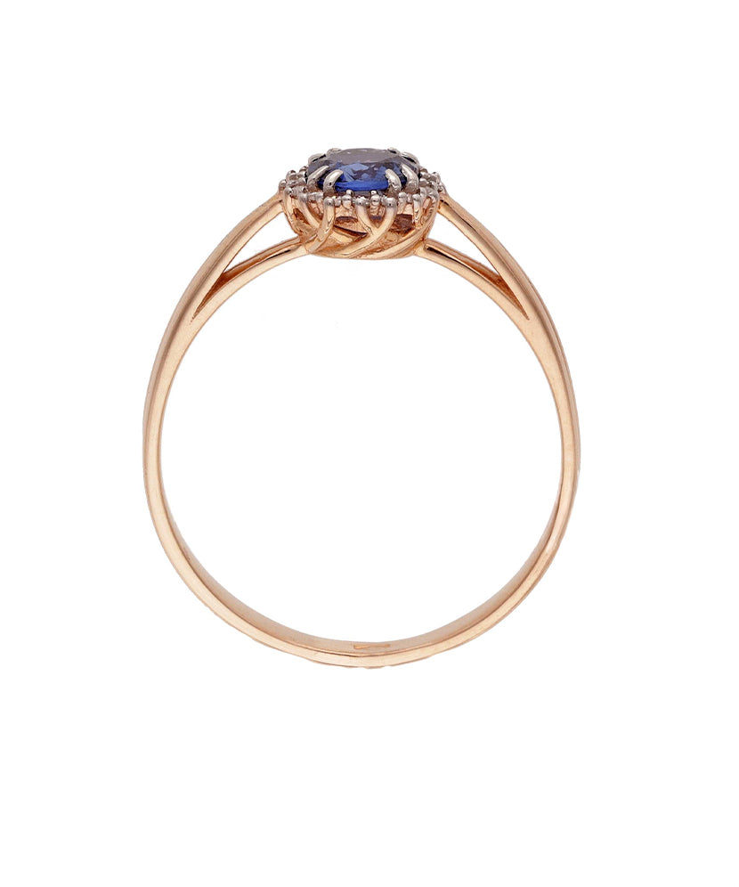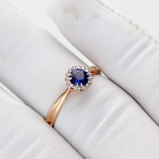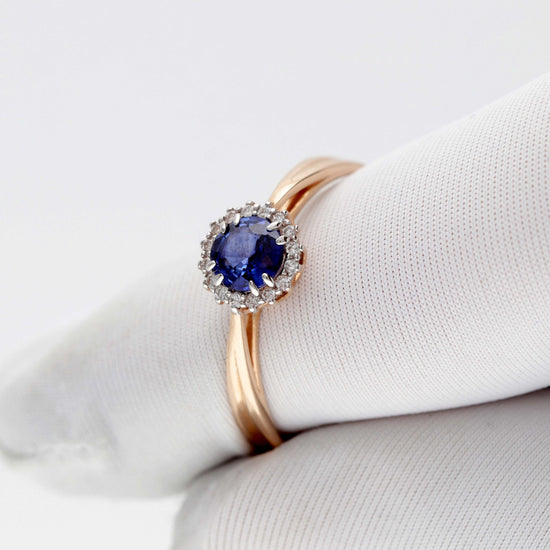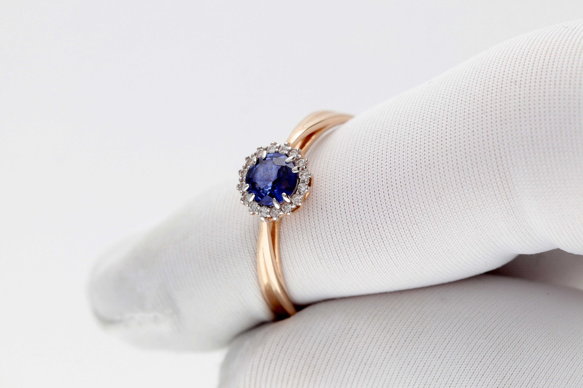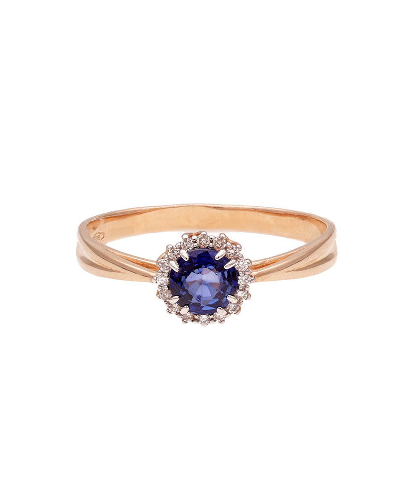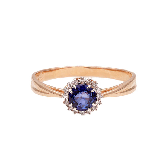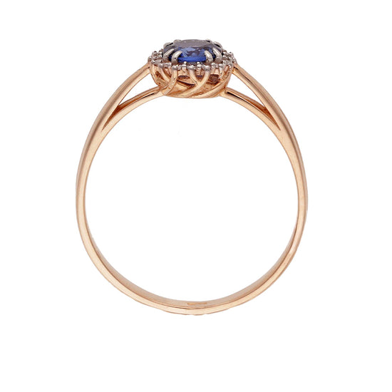 Spindintis rausvo aukso žiedas su natūraliu safyru ir deimantais. Klasikinis dizainas ir aukščiausios kokybės brangakmeniai pabrėžia laikui nepavaldų grožį.